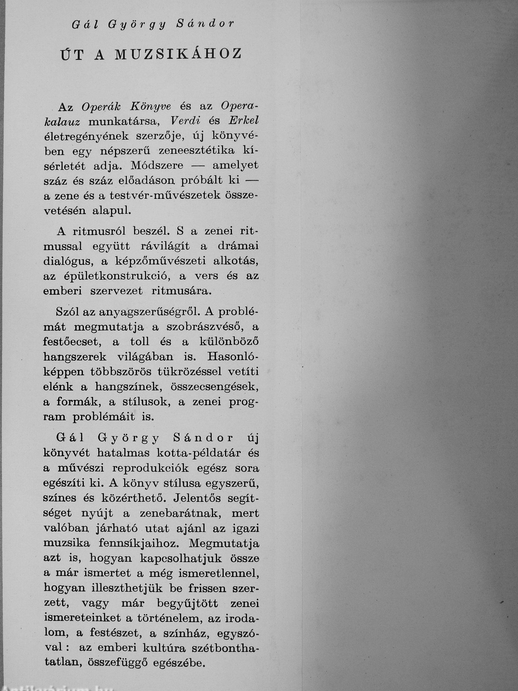 Gál György Sándor új könyvét hatalmas kotta-példatár és a művészi reprodukciók egész sora egészíti ki. A könyv stílusa egyszerű, színes és közérthető. Jelentős segítséget nyújt a zenebarátnak, mert valóban járható utat ajánl az igazi muzsika fennsíkjaihoz. Megmutatja azt is, hogyan kapcsolhatjuk össze a már ismertet a még ismeretlennel, hogyan illeszthetjük be frissen szerzett, vagy már begyűjtött zenei ismereteinket a történelem, az irodalom, a festészet, a színház, egyszóval : az emberi kultúra szétbontha-tatlan, összefüggő egészébe.