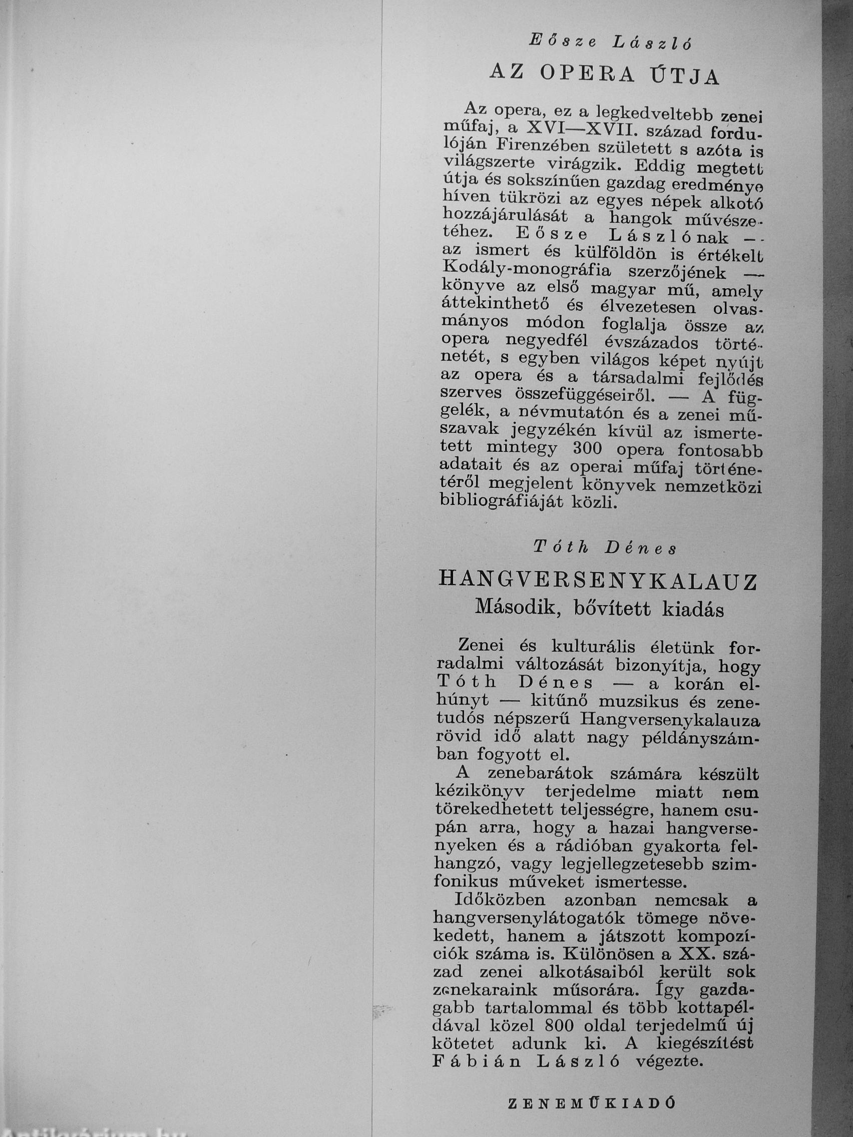 Az opera, ez a legkedveltebb zenei mMaj, a XVI—XVII. század fordulóján Firenzében született s azóta is világszerte virágzik. Eddig megtetü útja és sokszínűen gazdag eredménye híven tükrözi az egyes népek alkotó hozzájárulását a hangok művészetéhez. Eösze László nak - -az ismert és külföldön is értékeli Kodály-monográfia szerzőjének — könyve az első magyar mű, amely áttekinthető és élvezetesen olvasmányos módon foglalja össze az opera negyedfél évszázados történetét, s egyben világos képet nyújt az opera és a társadalmi fejlődés szerves összefüggéseiről. — A függelék, a névmutatón és a zenei műszavak jegyzékén kívül az ismertetett mintegy 300 opera fontosabb adatait és az operai műfaj történetéről megjelent könyvek nemzetközi bibliográfiáját közU.