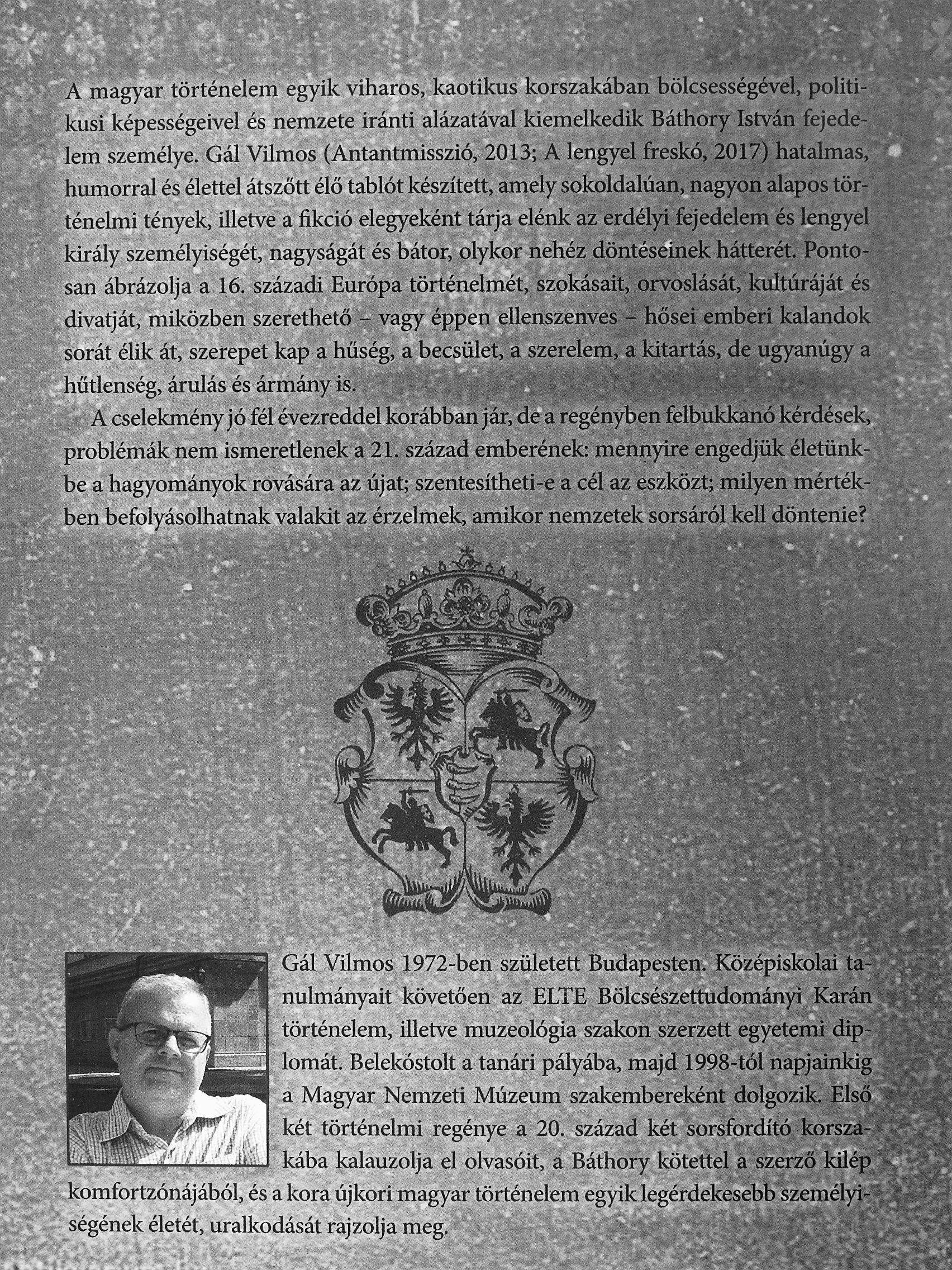 A magyar történelem egyik viharos, kaotikus korszakában bölcsességével, politikusi képességeivel és nemzete iránti alázatával kiemelkedik Báthory István fejedelem személye. Gál Vilmos (Antantmisszió, 2013; A lengyel freskó, 2017) hatalmas, humorral és élettel átszőtt élő tablót készített, amely sokoldalúan, nagyon alapos történelmi tények, illetve a fikció elegyeként tárja elénk az erdélyi fejedelem és lengyel király személyiségét, nagyságát és bátor, olykor nehéz döntéseinek hátterét. Pontosan ábrázolja a 16. századi Európa történelmét, szokásait, orvoslását, kultúráját és divatját, miközben szerethető - vagy éppen ellenszenves - hősei emberi kalandok sorát élik át, szerepet kap a hűség, a becsület, a szerelem, a kitartás, de ugyanúgy a hűüenség, árulás és ármány is. ? ' tí'"^