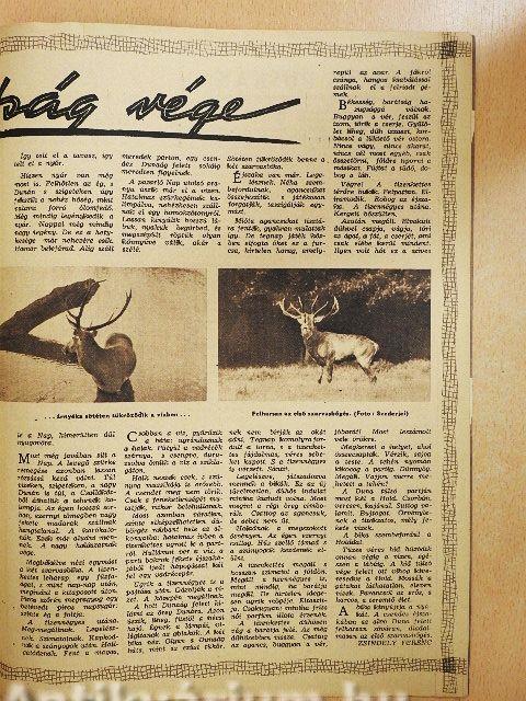 "Álmos meleg üli meg az augusztusi éjszakákat. az egyhangú tikkadtságot csak az erdő sóhajtása enyhíti susogó szellőjével. Ez a lágy fuvallat tele van az erdei sarjú, a nyárvégi virág bódító illatával, ami különös hangulatot ébreszt a vadász szívekben: az ünnepvárás hangulatát. És ahogy múlik az augusztus, mintha a természet is készülne a közelgő ünnepnapokra. A sárga tarlókat fekete ünneplőbe öltözteti az eke vasa. Az erdő is kezdi felölteni legszínpompásabb ruháját és esténként, hajnalonként fehér menyasszonyi ködfátyollal övezi magát. A nyári melegtől elsárgult erdei rétek néha gyémánt mezővé válnak hajnalra, a deres éjszakától."