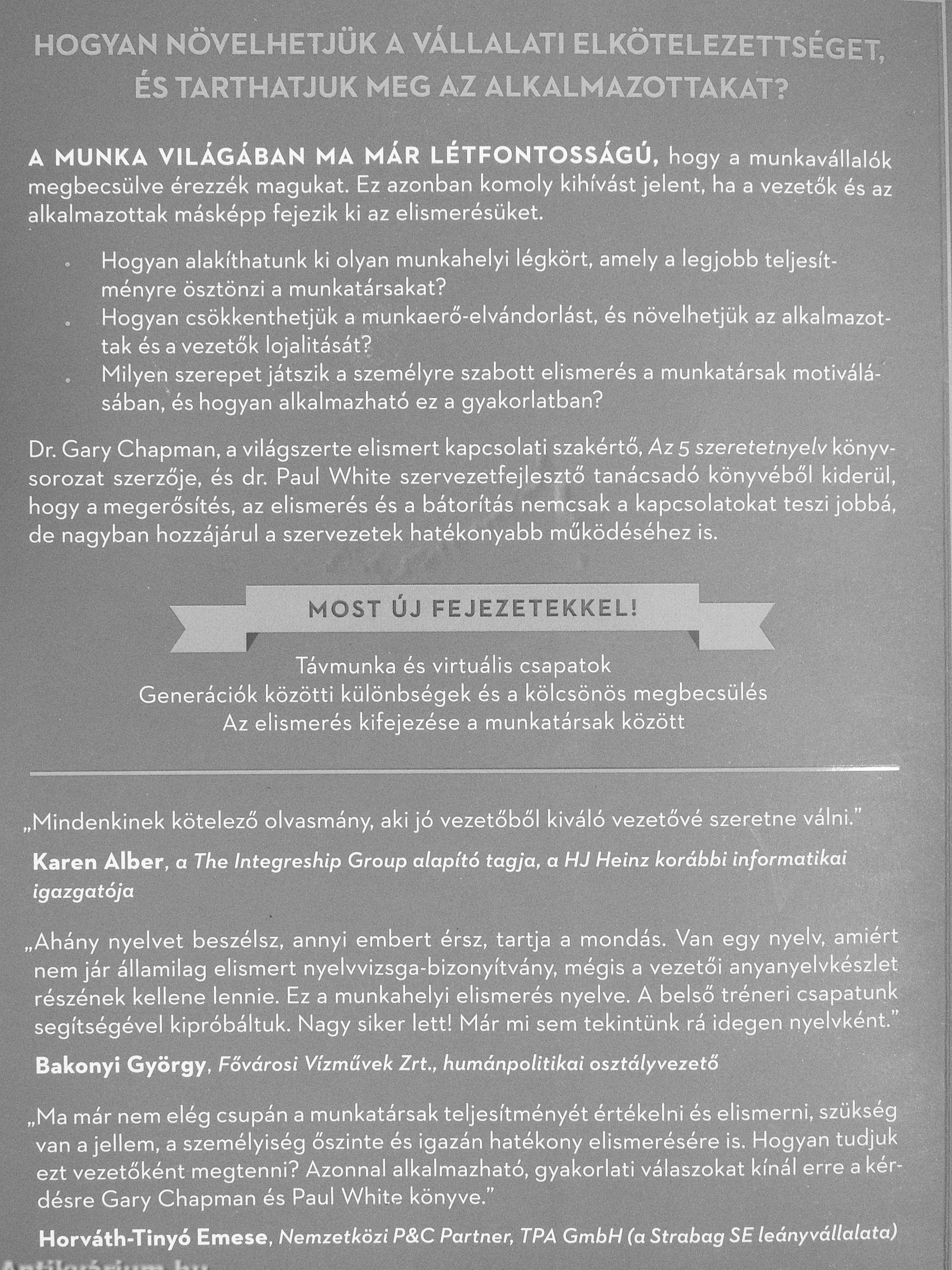 „Ma már nem elég csupán a munkatársak teljesítményét értékelni és elismerni, szükség van a jellem, a személyiség őszinte és igazán hatékony elismerésére is. Hogyan tudjuk ezt vezetőként megtenni? Azonnal alkalmazható, gyakorlati válaszokat kínál erre a kérdésre Gary Chapman és Paul White könyve."