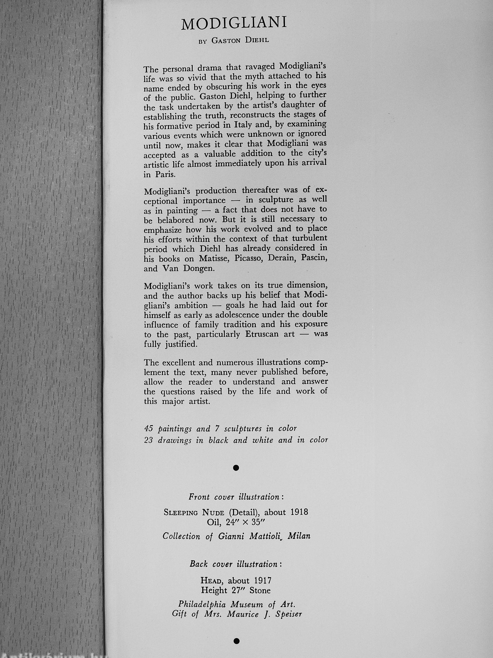 The personal drama that ravaged Modigliani's life was so vivid that the myth attached to his name ended by obscuring his woric in the eyes of the public. Gaston Diehl, helping to further the tasi; undertaken by the artist's daughter of establishing the truth, reconstructs the stages of his formative period in Italy and, by examining various events which were unknown or ignored until now, makes it clear that Modigliani was accepted as a valuable addition to the city's artistic life almost immediately upon his arrival in Paris.