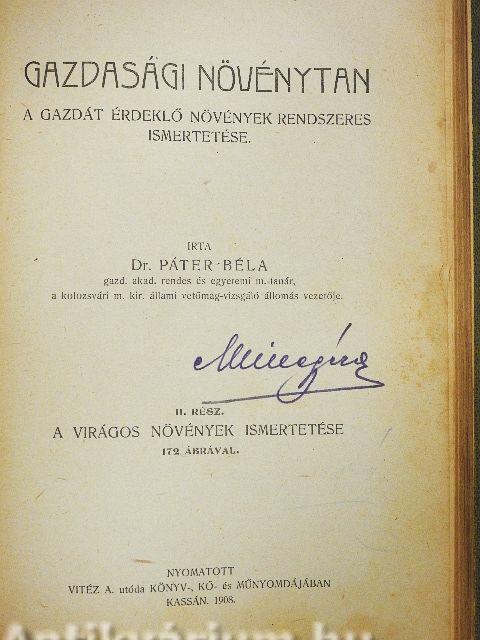 | Megjegyzés: | Második átdolgozott kiadás. Fekete-fehér ábrákkal. Irta: Dr. Páter Béla gazd. akadémiai rendes és egyetemi magántanár, a kolozsvári m. kir. állami vetőmagvizsgáló állomás vezetője. A második kötet kiadási éve: 1908. Nyomatott Vitéz A. utóda könyv-, kő- és műnyomdájában, Kassán. |