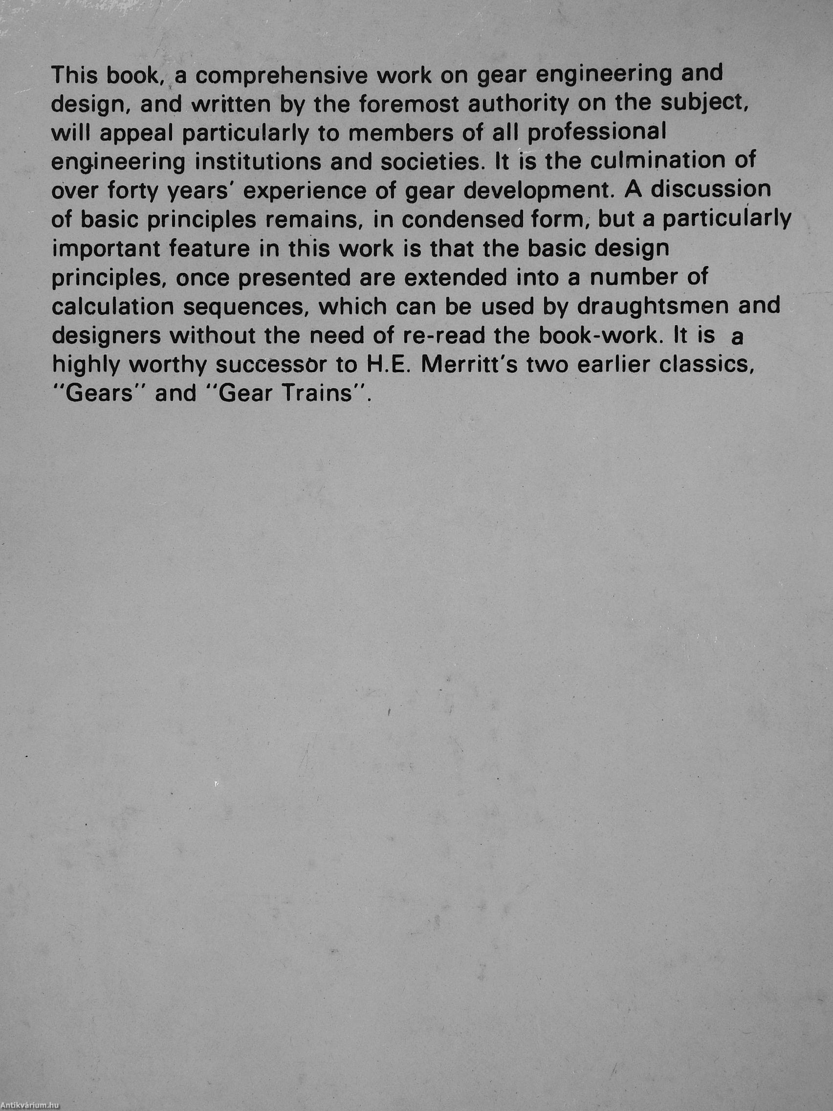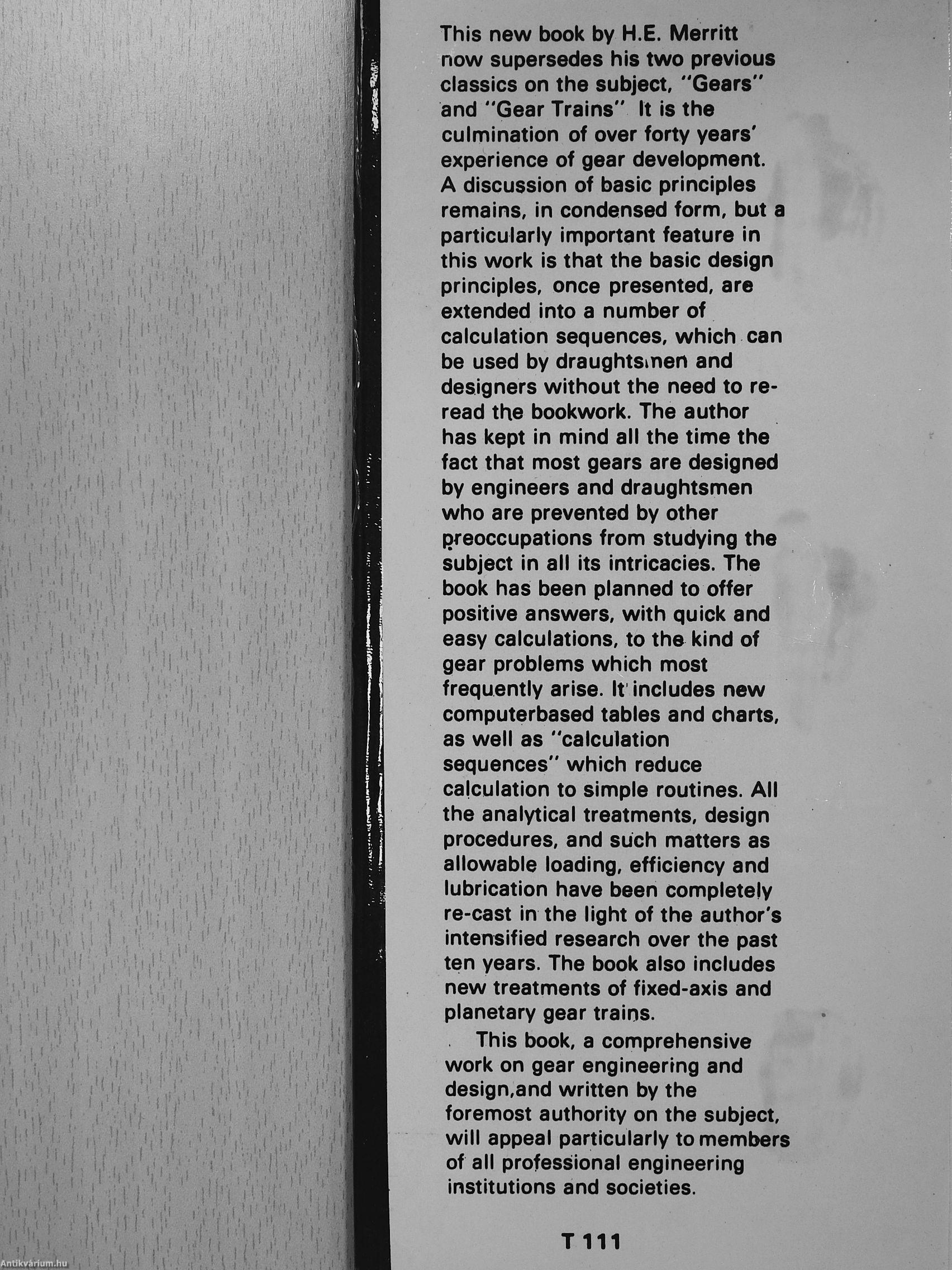 This new book by H.E. Merritt now supersedes his two previous classics on the subject, "Gears" and "Gear Trains" It is the culmination of over forty years' experience of gear development. A discussion of basic principles remains, in condensed form, but a particularly important feature in this work is that the basic design principles, once presented, are extended into a number of calculation sequences, which can be used by draughtsmen and designers without the need to reread the bookwork. The author has kept in mind all the time the fact that most gears are designed by engineers and draughtsmen who are prevented by other preoccupations from studying the subject in all its intricacies. The book has been planned to offer positive answers, with quick and easy calculations, to the kind of gear problems which most frequently arise. It includes new computerbased tables and charts, as well as "calculation sequences" which reduce calculation to simple routines. All the analytical treatments, design procedures, and such matters as allowable loading, efficiency and lubrication have been completely re-cast in the light of the author's intensified research over the past ten years. The book also includes new treatments of fixed-axis and planetary gear trains.