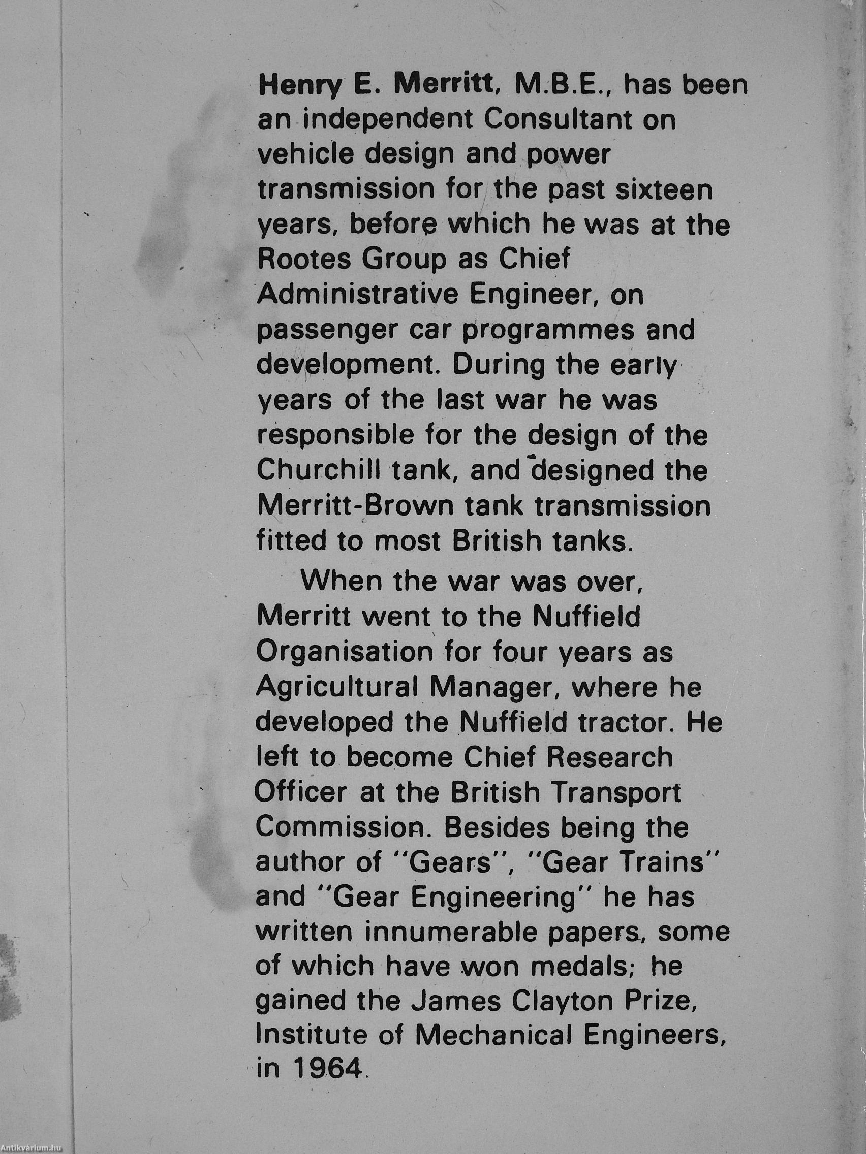When the war was over, Merritt went to the Nuffield Organisation for four years as Agricultural Manager, where he developed the Nuffield tractor. He left to become Chief Research Officer at the British Transport Commission. Besides being the author of "Gears", "Gear Trains" and "Gear Engineering" he has written innumerable papers, some of which have won medals; he gained the James Clayton Prize, Institute of Mechanical Engineers, in 1964