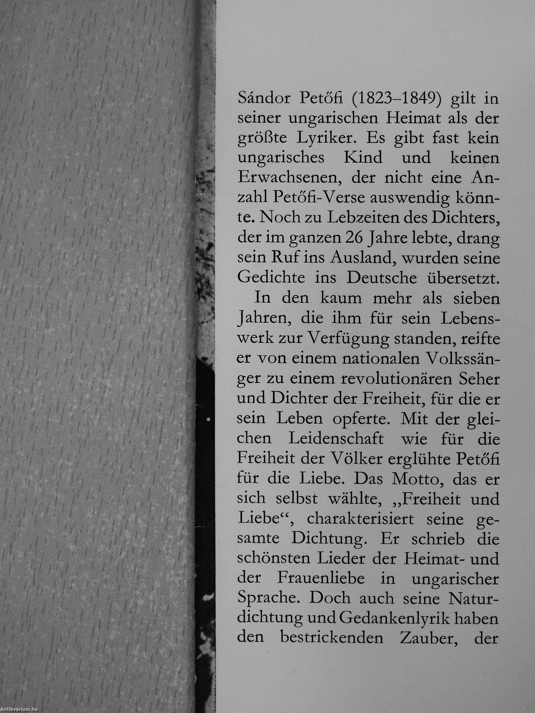 diesem jugendlichen Feuergeist der Dichtung eigen war und ihm seine unvergleichliche, bis heute unverminderte Popularität sicherte. Viele Dichter aller Sprachen haben es versucht und versuchen es immer wieder Petőfi nachzudichten.