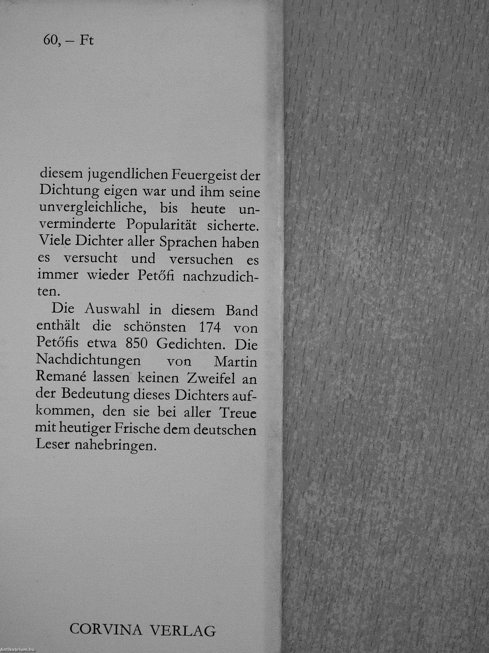 Die Auswahl in diesem Band enthält die schönsten 174 von Petőfis etwa 850 Gedichten. Die Nachdichtungen von Martin Remané lassen keinen Zweifel an der Bedeutung dieses Dichters aufkommen, den sie bei aller Treue mit heutiger Frische dem deutschen Leser nahebringen.