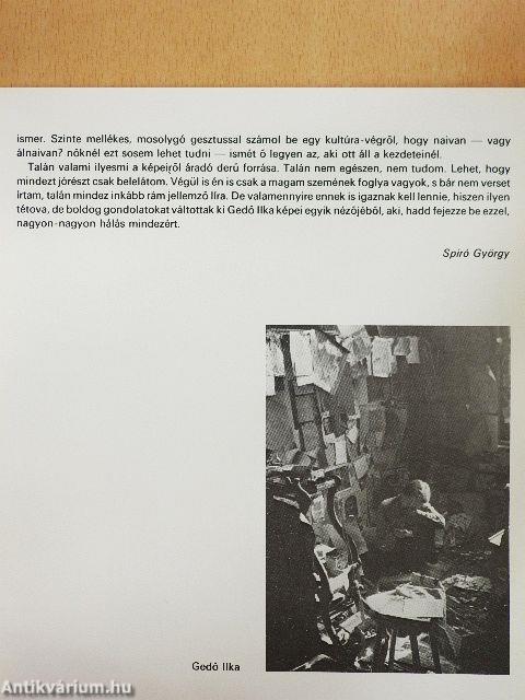 "Végignézi az ember Gedő Ilka képei és boldog lesz tőlük, mert ezek a képek nagyon szépek. Ez az egyetlen, ami biztonsággal elmondható. De hogy miért szépek és mitől szépek, az titok, s az ember, ha e képeket magyarázni akarja, máris bűnt követ el, mert éppen ezt a titkot szeretné szétfoszlatni, amire pedig aligha lehet fölhatalmazva bárki. De hát ezeket a képeket nézve valami dac is ébred az emberben, és úgy érzi: nem elég, hogy derűs boldogsággal nézhet valami szépet, nem elég, hogy tapasztalja: minden külső és belső szörnyűség ellenére valakiben munkál valami bizonyosság, ami talán kicsit kívül van az életen, talán kicsit mögötte van valahol, de azért az életbe is átsugárzik - mindez nem elég, mert olyan jó lenne valahogy mégis megfogalmazni ezt a titkot." Vissza