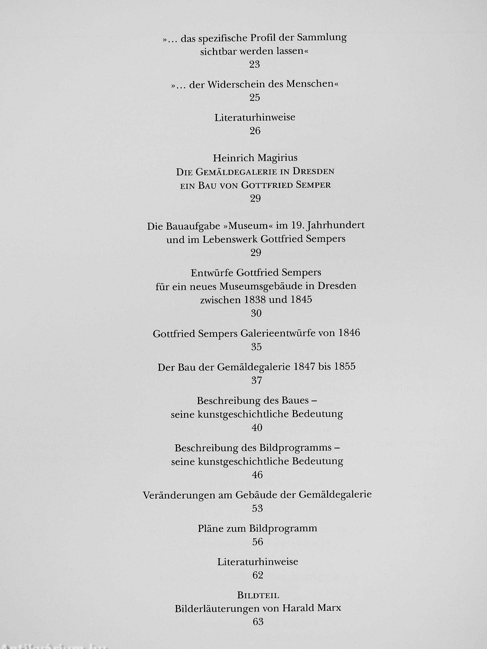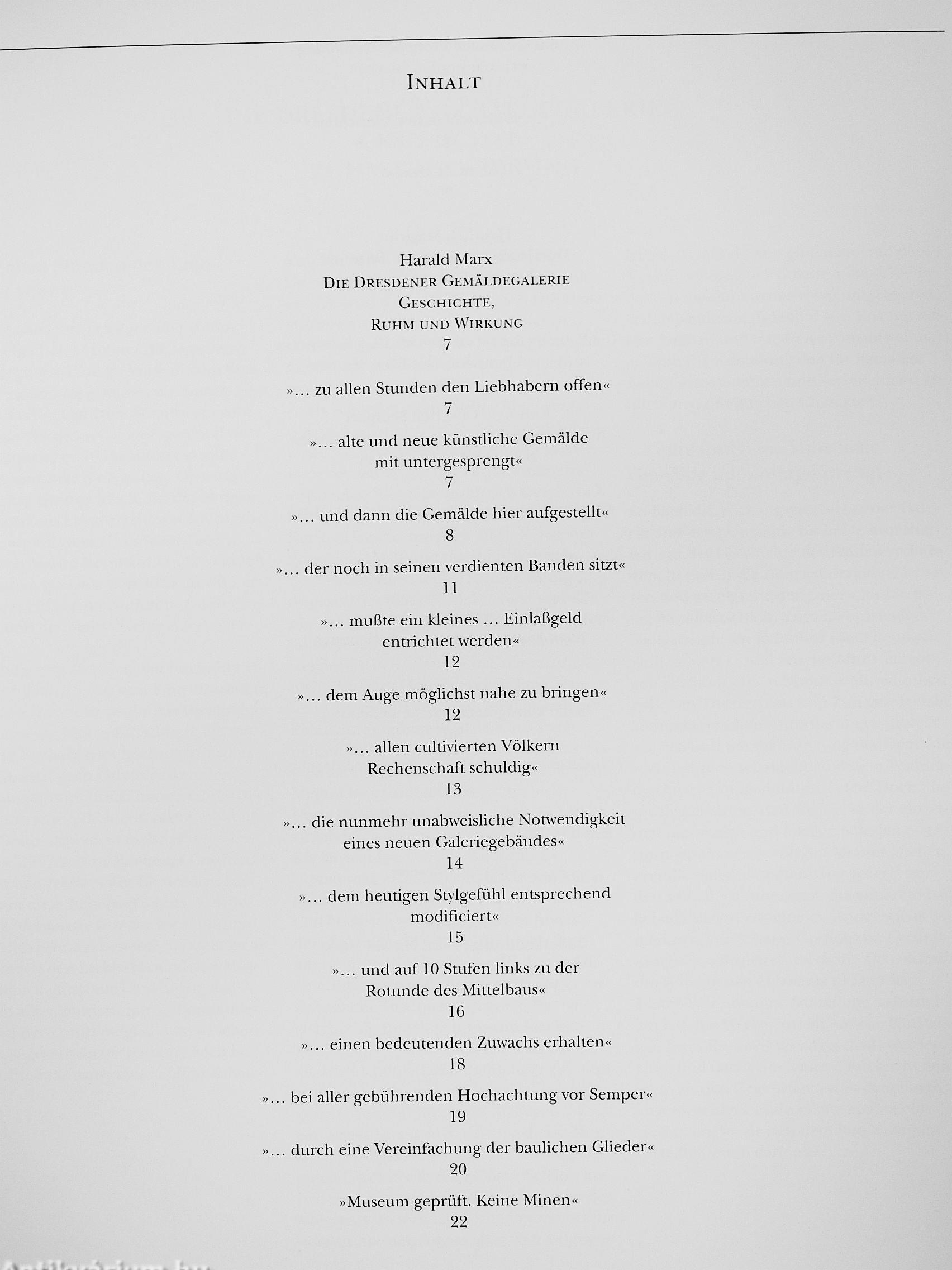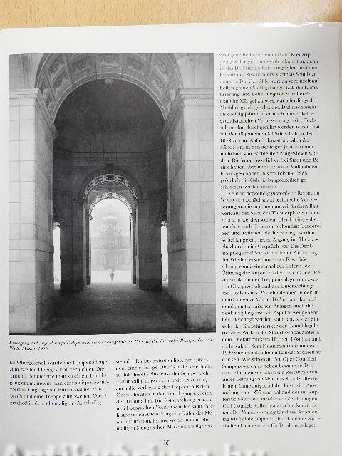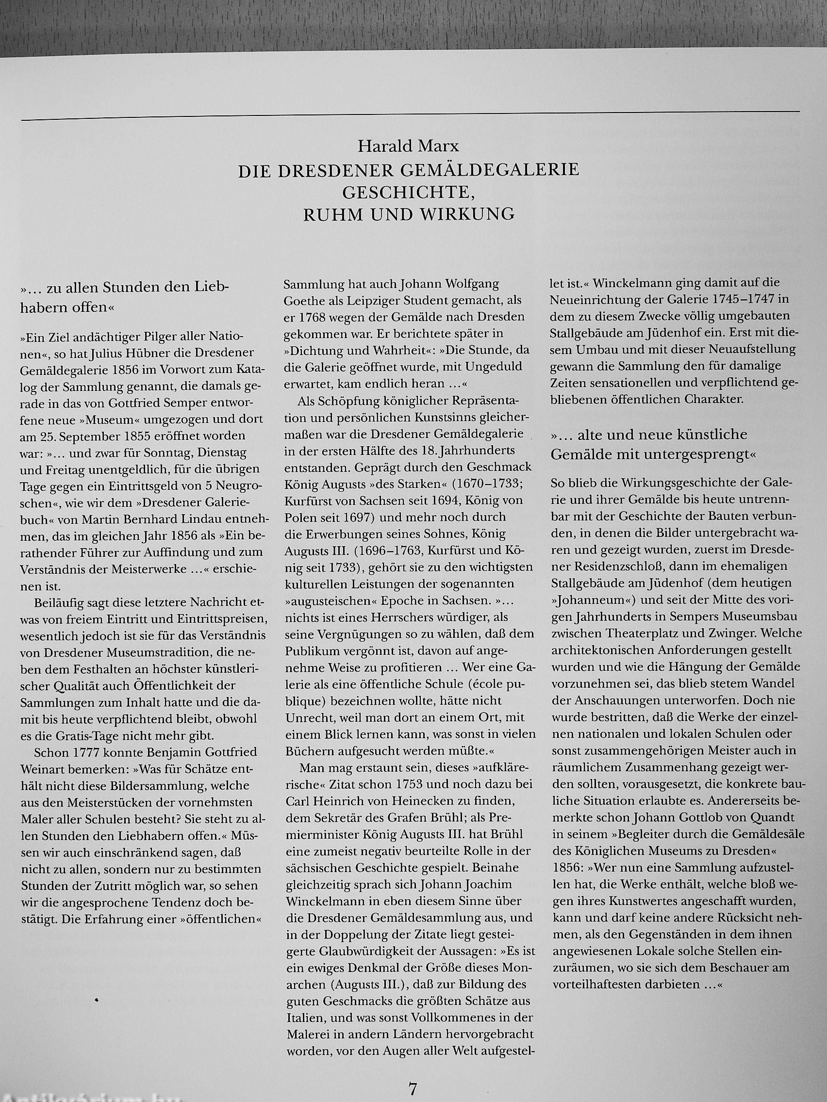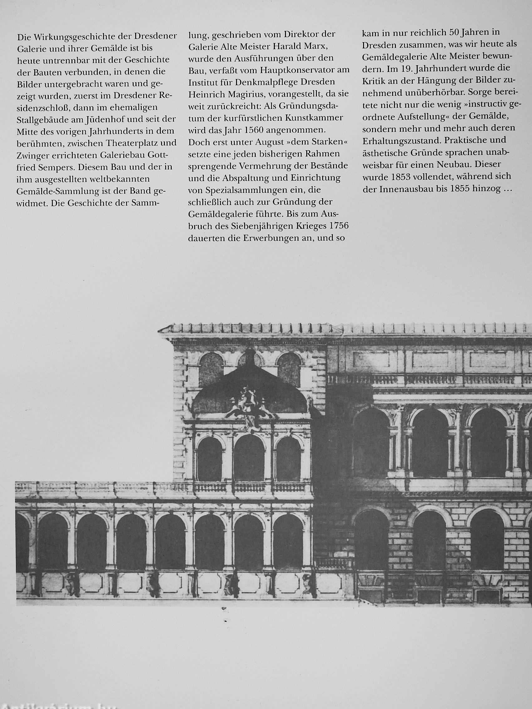 lung, geschrieben vom Direktor der Galerie Alte Meister Harald Marx, win-de den Ausführungen über den Bau, verfaßt vom Hauptkonservator am Institut für Denkmalpllege Dresden Heinrich Magirius, vorangestellt, da sie weit zurückreicht: Als Gründungsdatum der kurfürstlichen Kunstkammer wird das Jahr 1.560 angenommen. Doch erst unter August »dem Starken« setzte eine jeden bisherigen Rahmen sprengende Vermehrung der Bestände und die Abspaltung und Einrichtung von SpezialSammlungen ein, die schließlich auch zur Gründung der Gemäldegalerie führte. Bis zum Ausbruch des Siebenjährigen Krieges 1756 dauerten die Erwerbungen an, und so