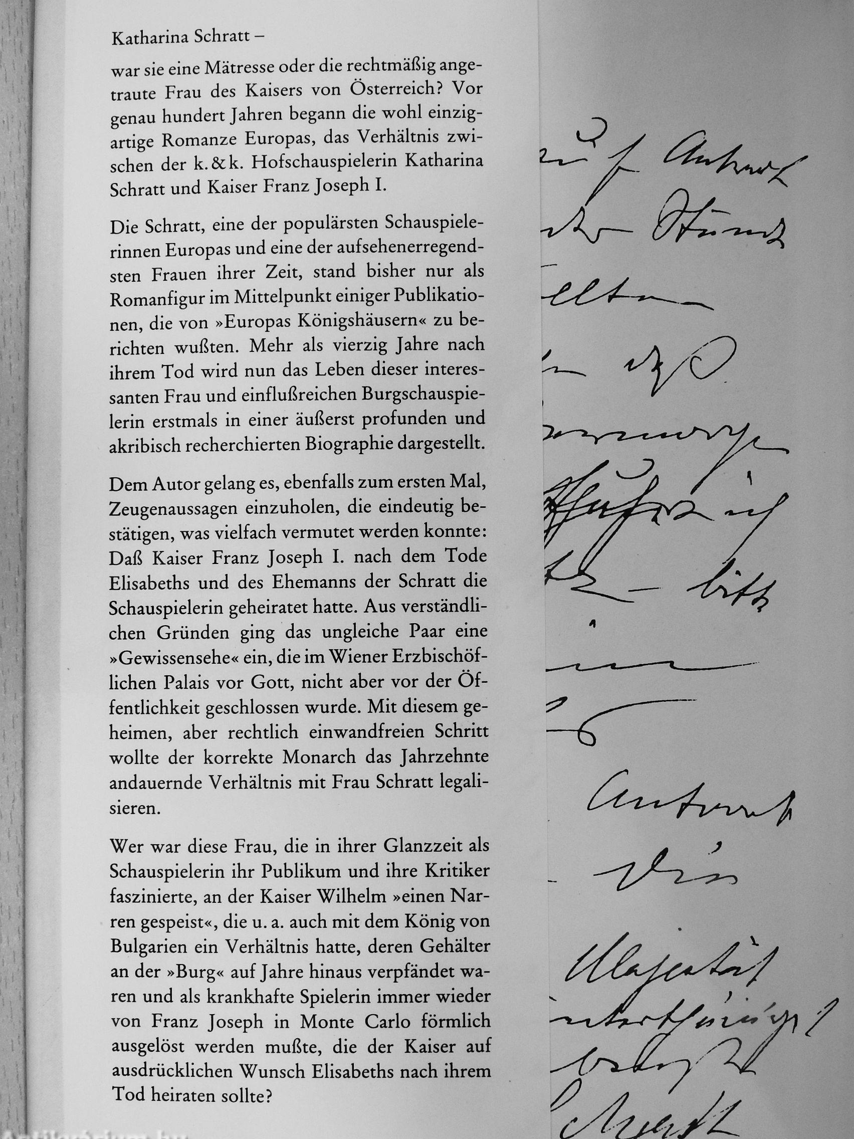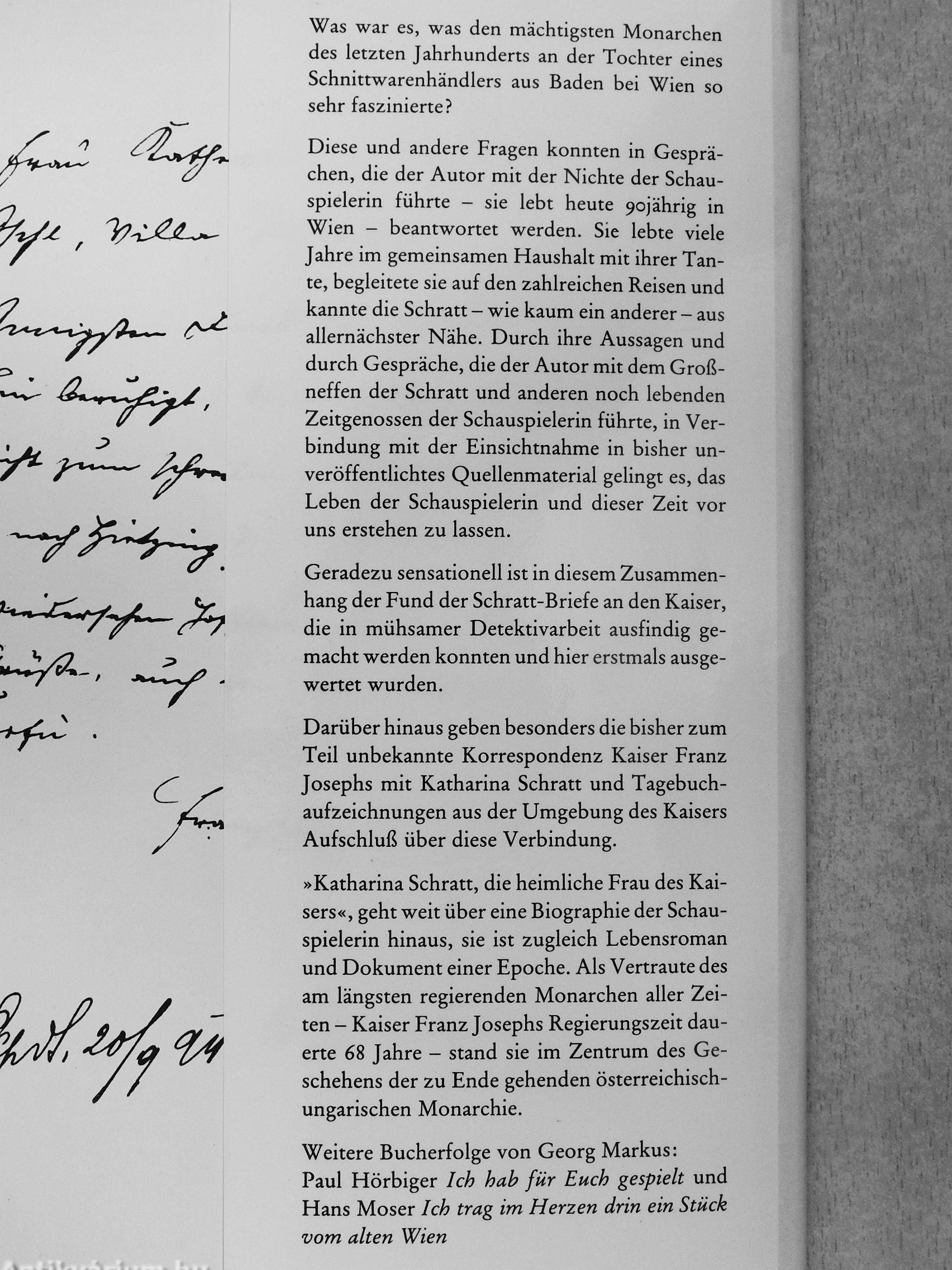 Geradezu sensationell ist in diesem Zusammenhang der Fund der Schratt-Briefe an den Kaiser, die in mühsamer Detektivarbeit ausfindig gemacht werden konnten und hier erstmals ausgewertet wurden.