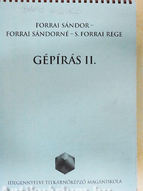 A Gépírás I. tankönyv befejezése után azonnal térjünk át a Gépírás II. tankönyvre. A második tankönyv gyakorlatai a betűk - ábécé sorrendben való - átismétlését, a reflexek megerősítését, továbbá a sebességfokozást szolgálják. A megfelelően előkészített (név, dátum, óraszám) papíron először mindig az ujjgyakorlatokat Íratjuk metronómra vagy zenére, a diákok suttogva mondják a betűket. A tempó mérsékelt legyen, mert itt nem a gyorsaság számít, csupán a betűk ismétlése, bemelegítés a cél. Az ujjgyakorlatokat Forrai Sándor: "Ujjgyakorlat gyűjtemény"-éből (1963.) vettük. Az ujjgyakorlatok után egyéni gyakorlás következik és Így Írják a sebességfokozó gyakorlatokat. A sebességfokozó gyakorlatokat nagyrészt Forrai Sándor: "Módszeres szópéldák a gépírási hibák javításához" c. (1962.) segédtankönyvéből vettük. Azért csak részben, mert abban az időben az 1, ú, ű az Írógépen még nem szerepelt. A sebességfokozó gyakorlatok írásánál rendkívül fontos, hogy a diákok suttogva betűzzenek, mert csak így sikerül a hibátlanságot biztosítani. A gépelésbe érzékszerveinket a következőképpen vonjuk be: a szem meglátja, a száj suttogja, a fül meghallja, az ujjak pedig a már kialakított feltételes reflexek alapján Írják. Abban az esetben, amikor ez a folyamat, azaz a reflexműködés megbomlik, valami megzavarja, bekövetkezhet a hibázás. Amikor hibáztunk, nagyon fontos, hogy utána lassúbb tempóban folytassuk a betűzve Írást, és csak fokozatosan vegyük fel a megszokott tempót, nehogy hibabokor alakuljon ki. Az egyes gyakorlatokon belül kb. 300 + 300 leütésnyi szöveg feldolgozására kerül sor olyképpen, hogy fokozatosan kiegészülő szavakat iratunk. Pl. nemzetiségű: nem, nemzeti, nemzetiségű; összetett szavak esetében pl. kortárs: kor, társ, kortárs. A szövegfeldolgozásnál is nagyon fontos az ütemes, egyenletes Írás, még akkor is, ha valamelyik szórészt sokkal gyorsabban tudnánk Írni. A sebességfokozás, a szöveg feldolgozásának módszere a magasabb rendű idegműködés elve alapján a dinamikus sztereotipekre, azaz a láncreflexekre épül fel. A 300 leütésnyi másolási szöveget fel lehet használni egy- vagy többperces másolásra is. Az egyes gyakorlatok végén az átismételt betűnek megfelelően helyesírási gyakorlatok, ritkábban problémás elválasztások találhatók, amelyeket a diákok általában elhibáznak. A figyelem-összpontosítást szolgálják az idegen szövegek (angol, német) is, melyek minden negyedik gyakorlatban találhatók. Ezután következik kb. 1800 leütésnyi másolási szöveg, melyből tízperces másolást lehet íratni. A könyv végén található az egyes gyakorlatokban előforduló idegen szavak, kifejezések magyarázata. A második könyvhöz szervesen kapcsolódik a "Szöveggyűjtemény" és az "Egyszerű iratminta- és levélgyűjtemény". A szöveggyűjtemény száz különböző témakörökből merített szöveget foglal magában, mellőzve a politikai és az átalakulással kapcsolatos gazdasági szövegeket. A szövegeket tízperces másolásokra, hibátlansági másolásokra használhatjuk. A szöveggyűjtemény végén található a benne előforduló idegen szavak, kifejezések magyarázata. Az Iratminta és levélgyűjtemény bőségesen tartalmaz ömlesztett formában egyszerű iratmintákat, leveleket, jegyzőkönyveket, hogy ezeket a diákok a szabványnak megfelelően, formába öntve jól begyakorolhassák.