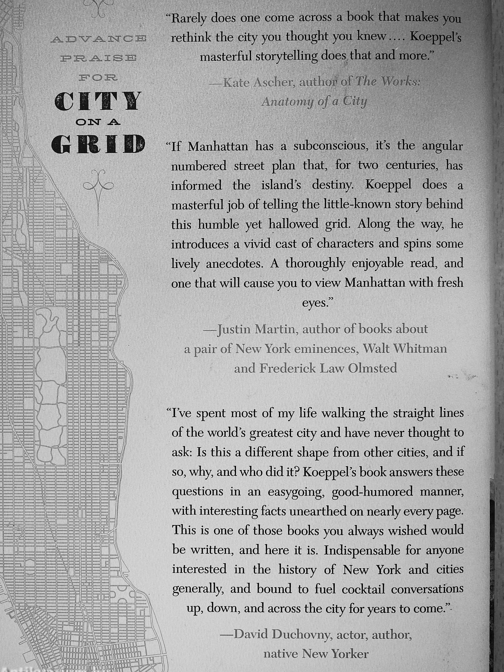 I've spent most of my life walking the straight lines of the world's greatest city and have never thought to ask: Is this a different shape from other cities, and if so, why, and who did it? Koeppel's book answers these questions in an easygoing, good-humored manner, with interesting facts unearthed on nearly every page. This is one of those books you always wished would be written, and here it is. Indispensable for anyone interested in the history of New York and cities generally, and bound to fuel cocktail conversations up, down, and across the city for years to come."-