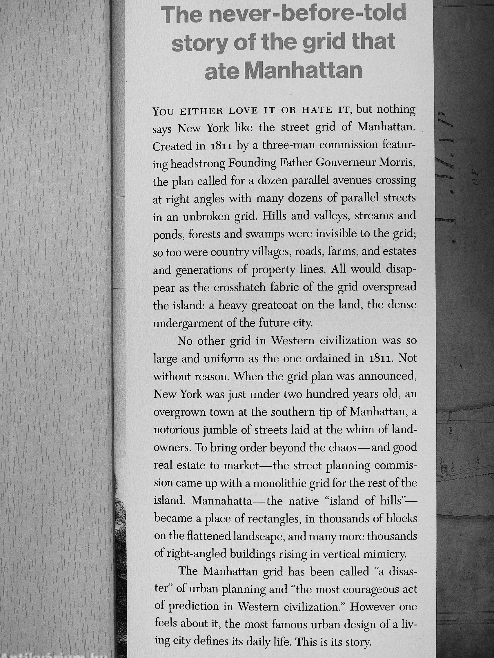 You EITHER LOVE IT OR HATE IT, but nothing says New York like the street grid of Manhattan. Created in i8ii by a three-man commission featuring headstrong Founding Father Gouverneur Morris, the plan called for a dozen parallel avenues crossing at right angles with many dozens of parallel streets in an unbroken grid. Hills and valleys, streams and ponds, forests and swamps were invisible to the grid; so too were country villages, roads, farms, and estates and generations of property lines. All would disappear as the crosshatch fabric of the grid overspread the island: a heavy greatcoat on the land, the dense undergarment of the future city.