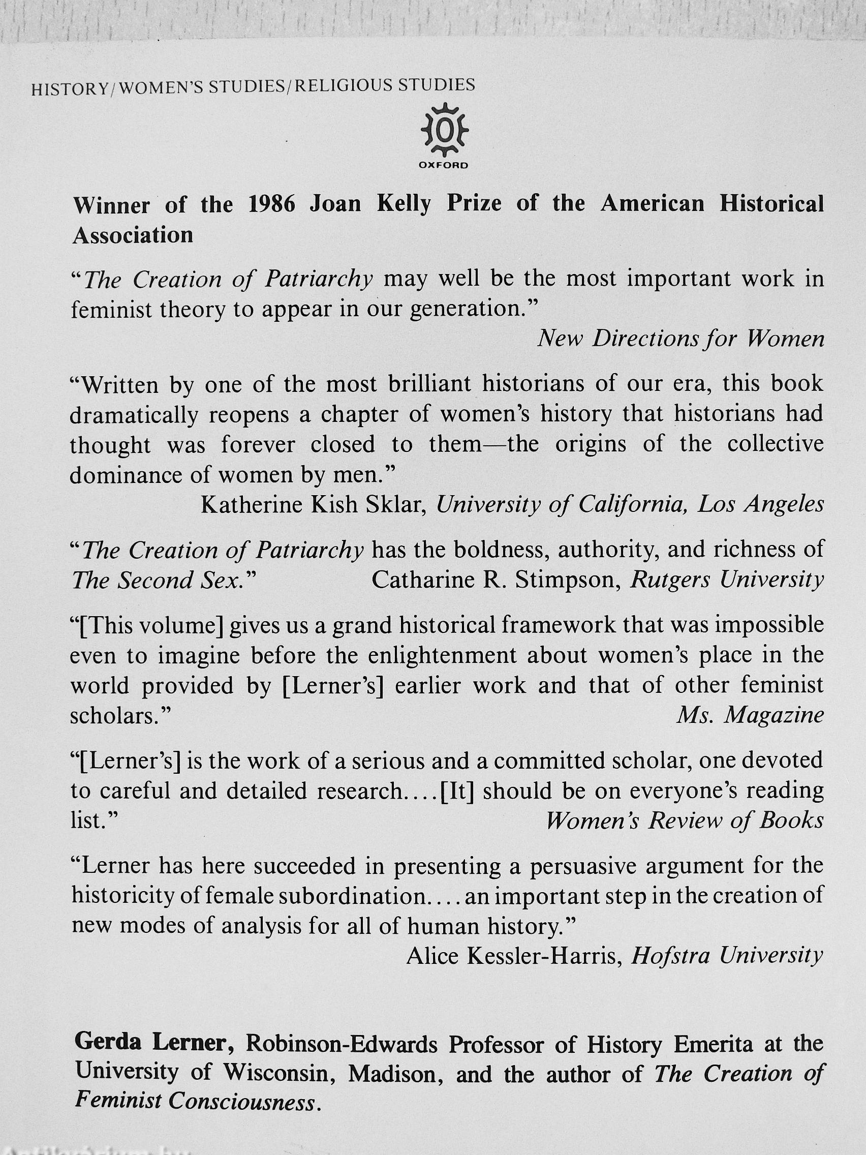 "[Lerner's] is the work of a serious and a committed scholar, one devoted to careful and detailed research [It] should be on everyone's reading list." Women's Review of Books