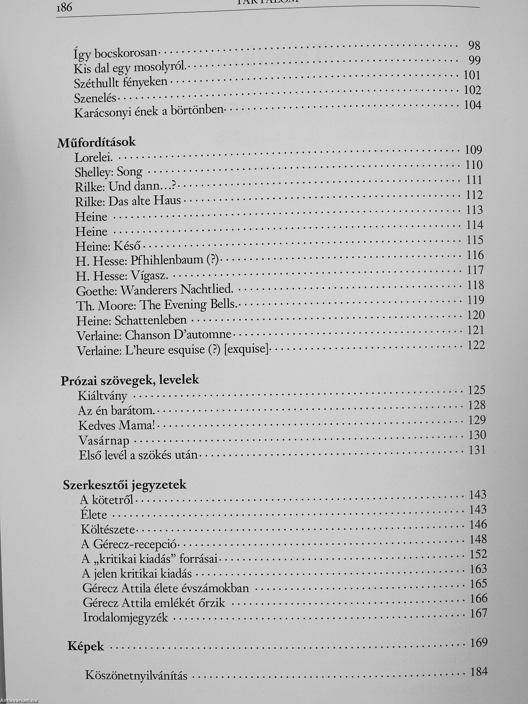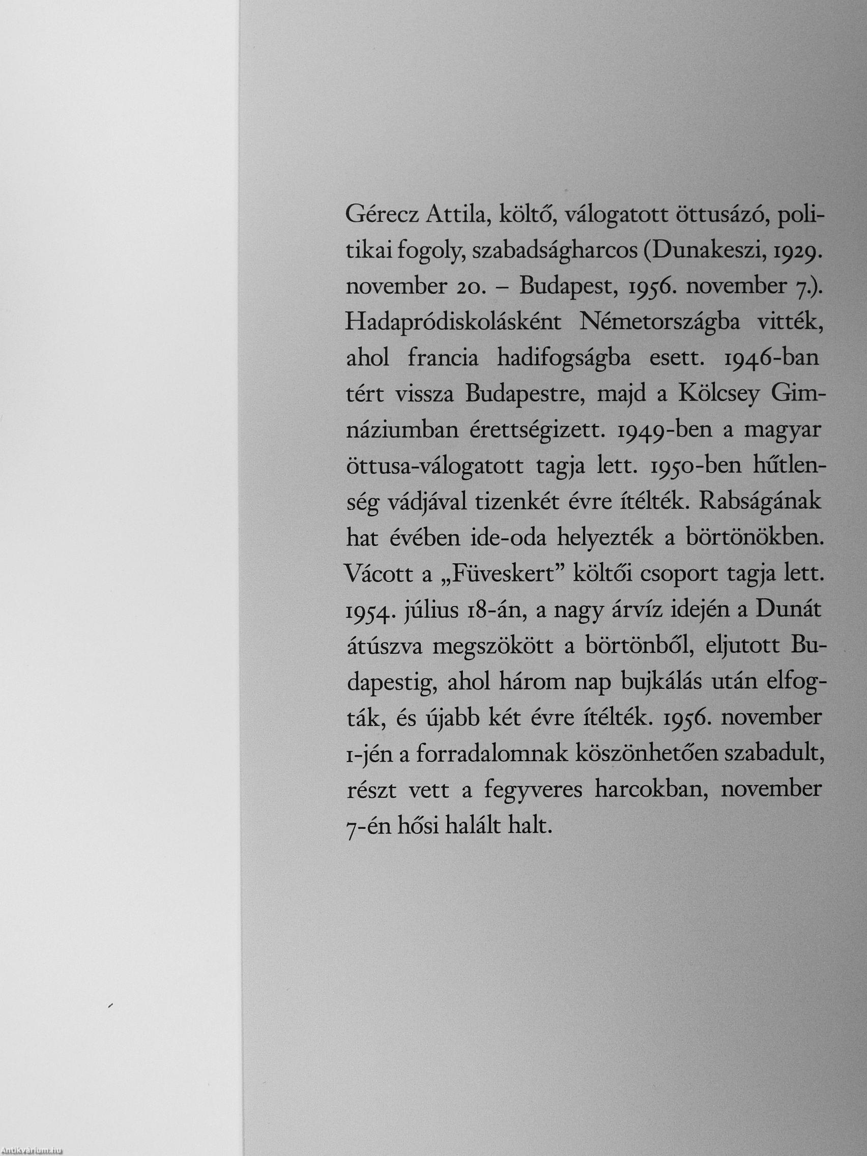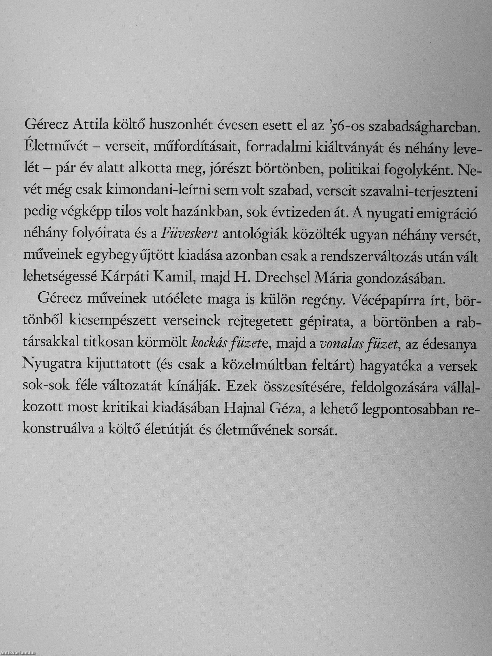 Gérecz Attila költő huszonhét évesen esett el az '56-os szabadságharcban. Eletmiívét - verseit, műfordításait, forradalmi kiáltványát és néhány levelét - pár év alatt alkotta meg, jórészt börtönben, politikai fogolyként. Nevét még csak kimondani-leírni sem volt szabad, verseit szavalni-terjeszteni pedig végképp tilos volt hazánkban, sok évtizeden át. A nyugati emigráció néhány folyóirata és a Füveskert antológiák közölték ugyan néhány versét, műveinek egybegyűjtött kiadása azonban csak a rendszerváltozás után vált lehetségessé Kárpáti Kamii, majd H. Drechsel Mária gondozásában.