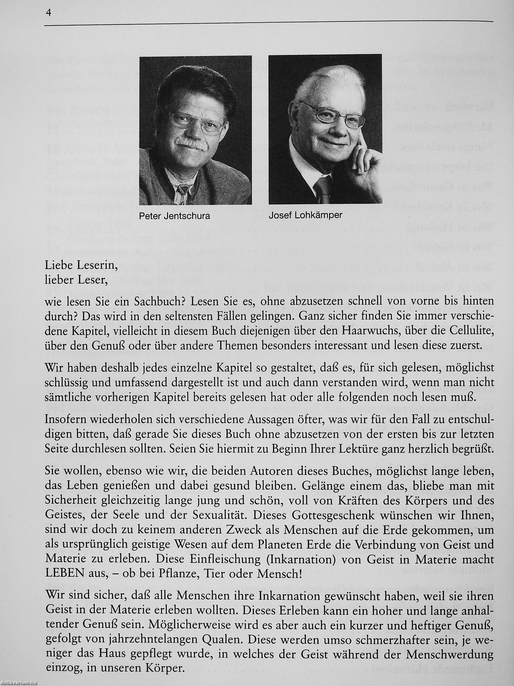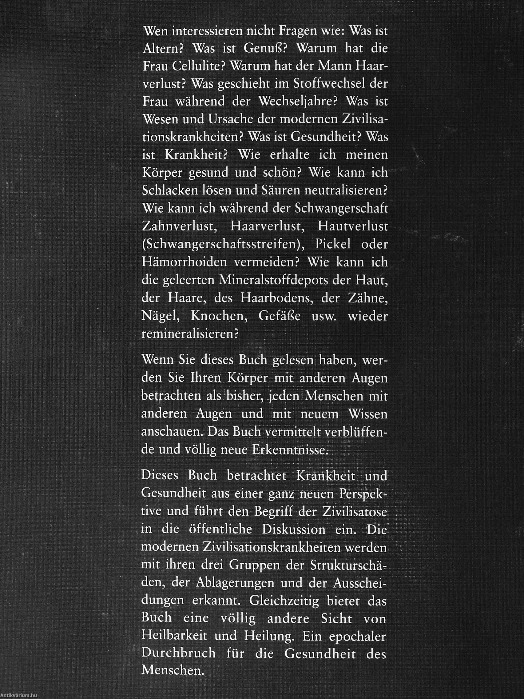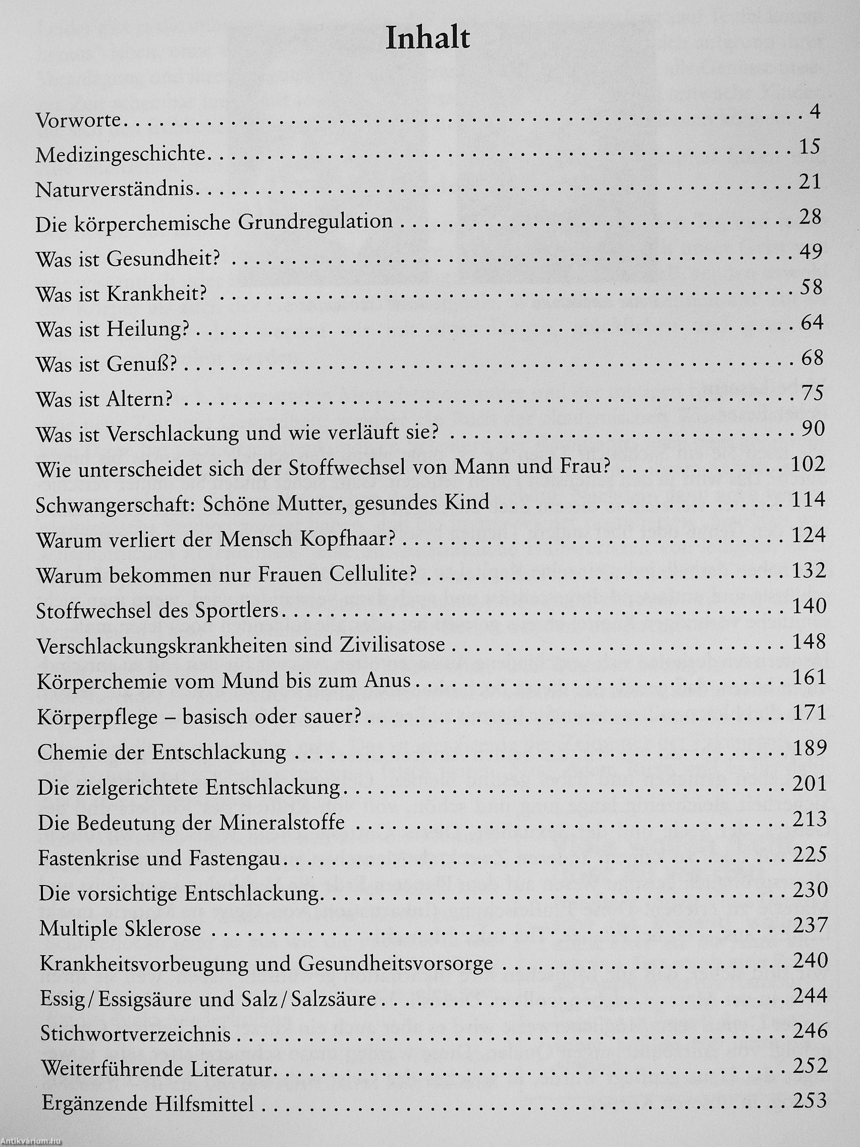 Wen interessieren nicht Fragen wie: Was ist Altern? Was ist Genuß? Warum hat die Frau Cellulite? Warum hat der Mann Haarverlust? Was geschieht im Stoffwechsel der Frau während der Wechseljahre? Was ist Wesen und Ursache der modernen Zivilisationskrankheiten? Was ist Gesundheit? Was ist Krankheit? Wie erhalte ich meinen Körper gesund und schön? Wie kann ich Schlacken lösen und Säuren neutralisieren? Wie kann ich während der Schwangerschaft Zahnverlust, Haarverlust, Hautverlust (Schwangerschaftsstreifen), Pickel oder Hämorrhoiden vermeiden? Wie kann ich die geleerten Mineralstoffdepots der Haut, der Haare, des Haarbodens, der Zähne, Nägel, Knochen, Gefäße usw. wieder remineralisieren?