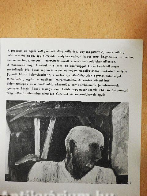 Giczy János mintegy tíz éves festő-pályájának utolsó ötévi termését mutatja be. Hasonló programmal indult, mint a vásárhelyiek, s eredményei bizonyítják, hogy ez a hatvanas évek hazai festészetének egyik legtermékenyebb, s még mindig megújulásra képes iránya.