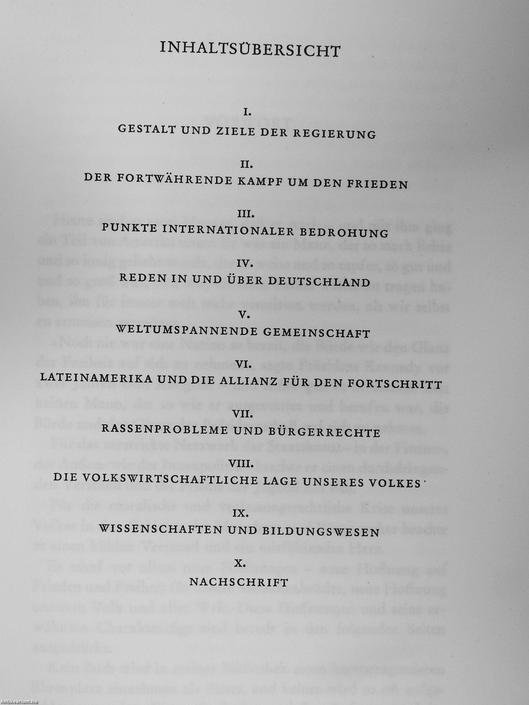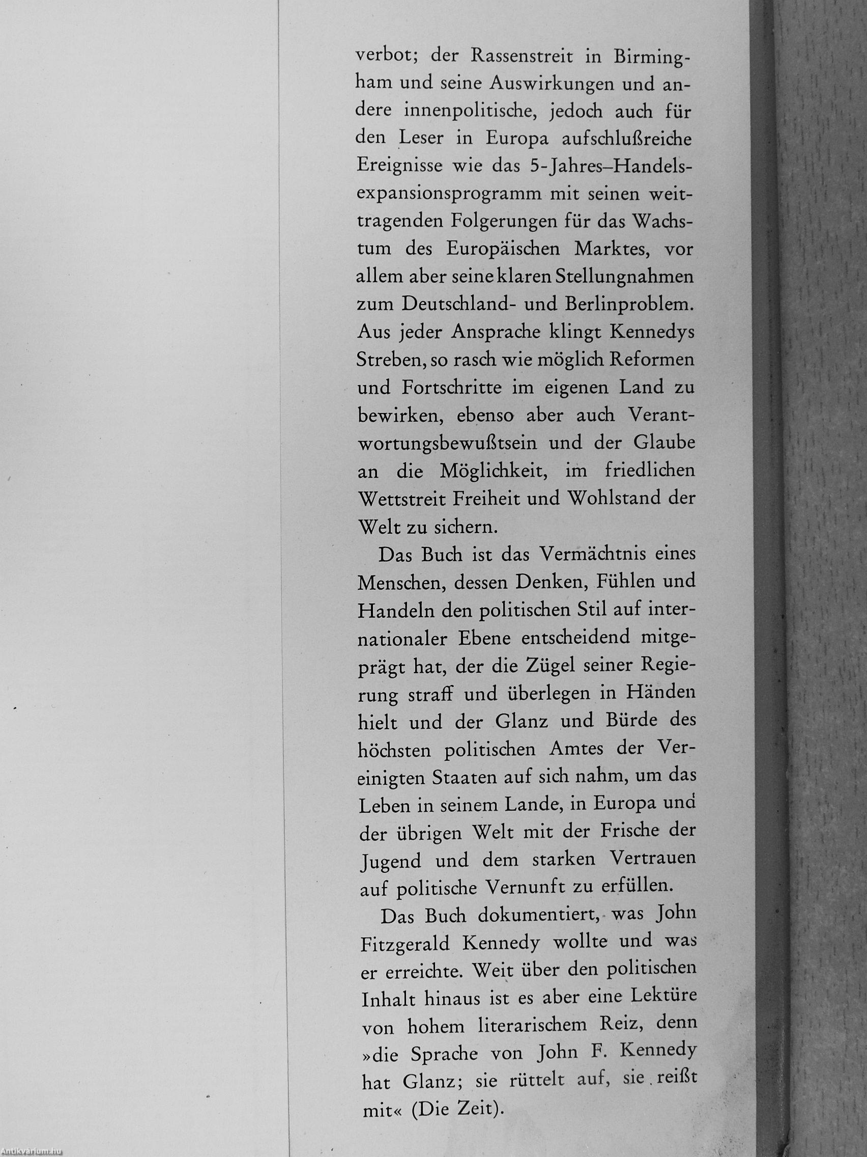 verbot; der Rassenstreit in Birmingham und seine Auswirkungen und andere innenpolitische, jedoch auch für den Leser in Europa aufschlußreiche Ereignisse wie das 5-Jahres-Handels-expansionsprogramm mit seinen weittragenden Folgerungen für das Wachstum des Europäischen Marktes, vor allem aber seine klaren Stellungnahmen zum Deutschland- und Berlinproblem. Aus jeder Ansprache klingt Kennedys Streben, so rasch wie möglich Reformen und Fortschritte im eigenen Land zu bewirken, ebenso aber auch Verantwortungsbewußtsein und der Glaube an die Möglichkeit, im friedlichen Wettstreit Freiheit und Wohlstand der Welt zu sichern.