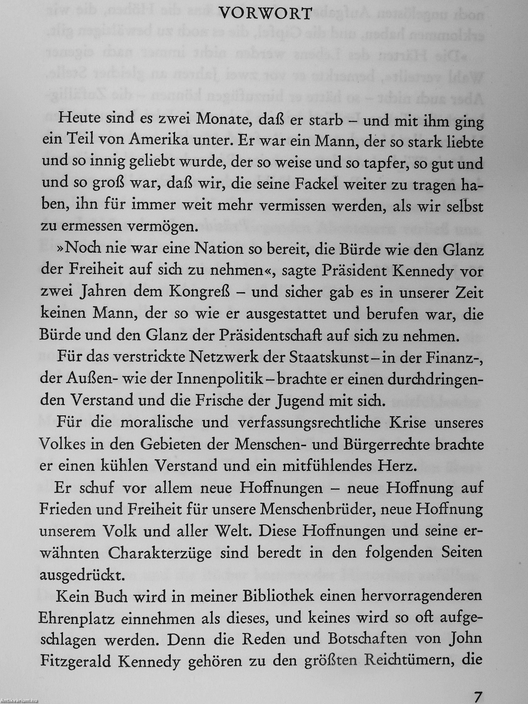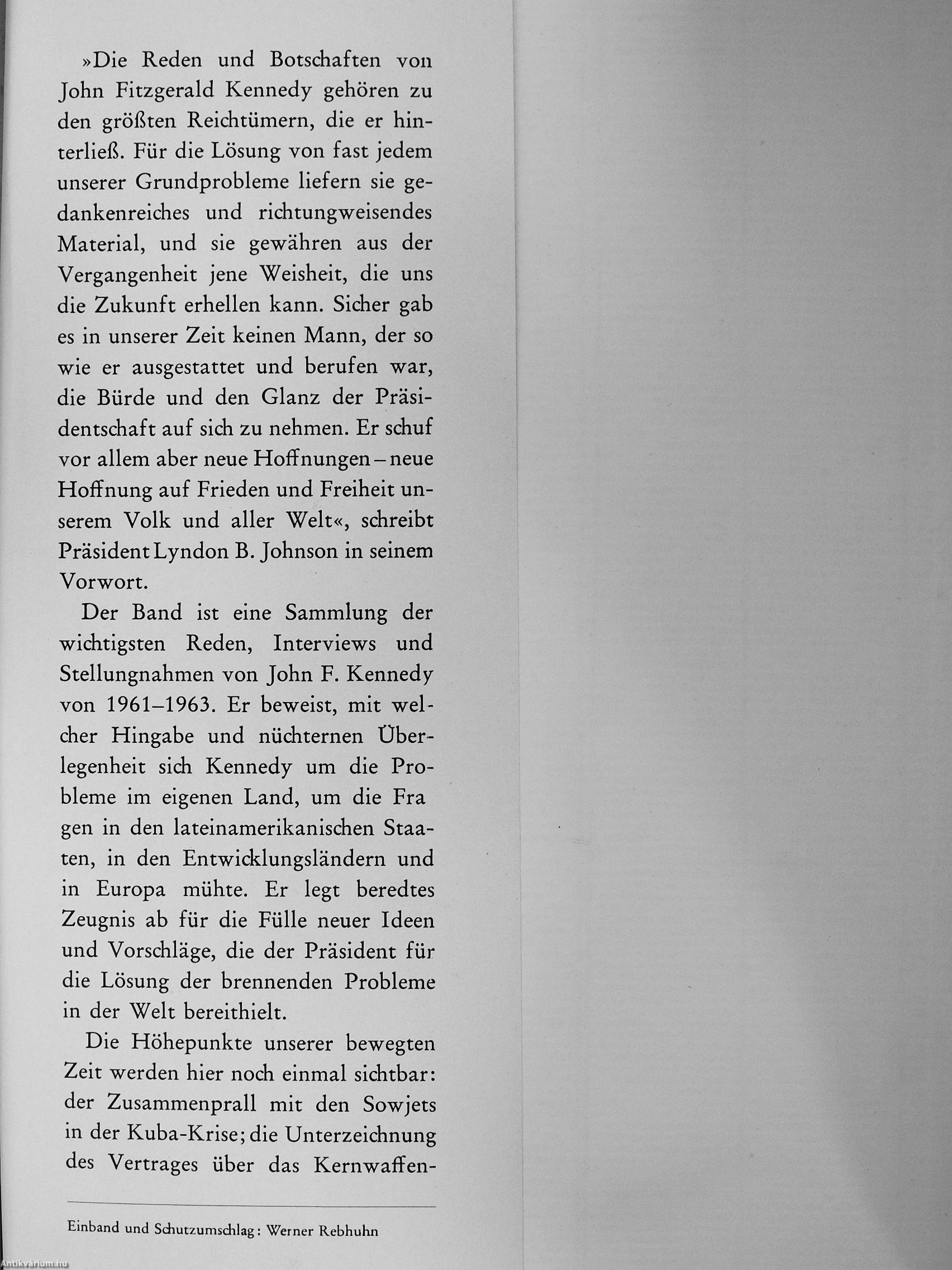 »Die Reden und Botschaften von John Fitzgerald Kennedy gehören zu den größten Reichtümern, die er hinterließ. Für die Lösung von fast jedem unserer Grundprobleme liefern sie gedankenreiches und richtungweisendes Material, und sie gewähren aus der Vergangenheit jene Weisheit, die uns die Zukunft erhellen kann. Sicher gab es in unserer Zeit keinen Mann, der so wie er ausgestattet und berufen war, die Bürde und den Glanz der Präsidentschaft auf sich zu nehmen. Er schuf vor allem aber neue Hoffnungen - neue Hoffnung auf Frieden und Freiheit unserem Volk und aller Welt«, schreibt Präsident Lyndon B. Johnson in seinem Vorwort.