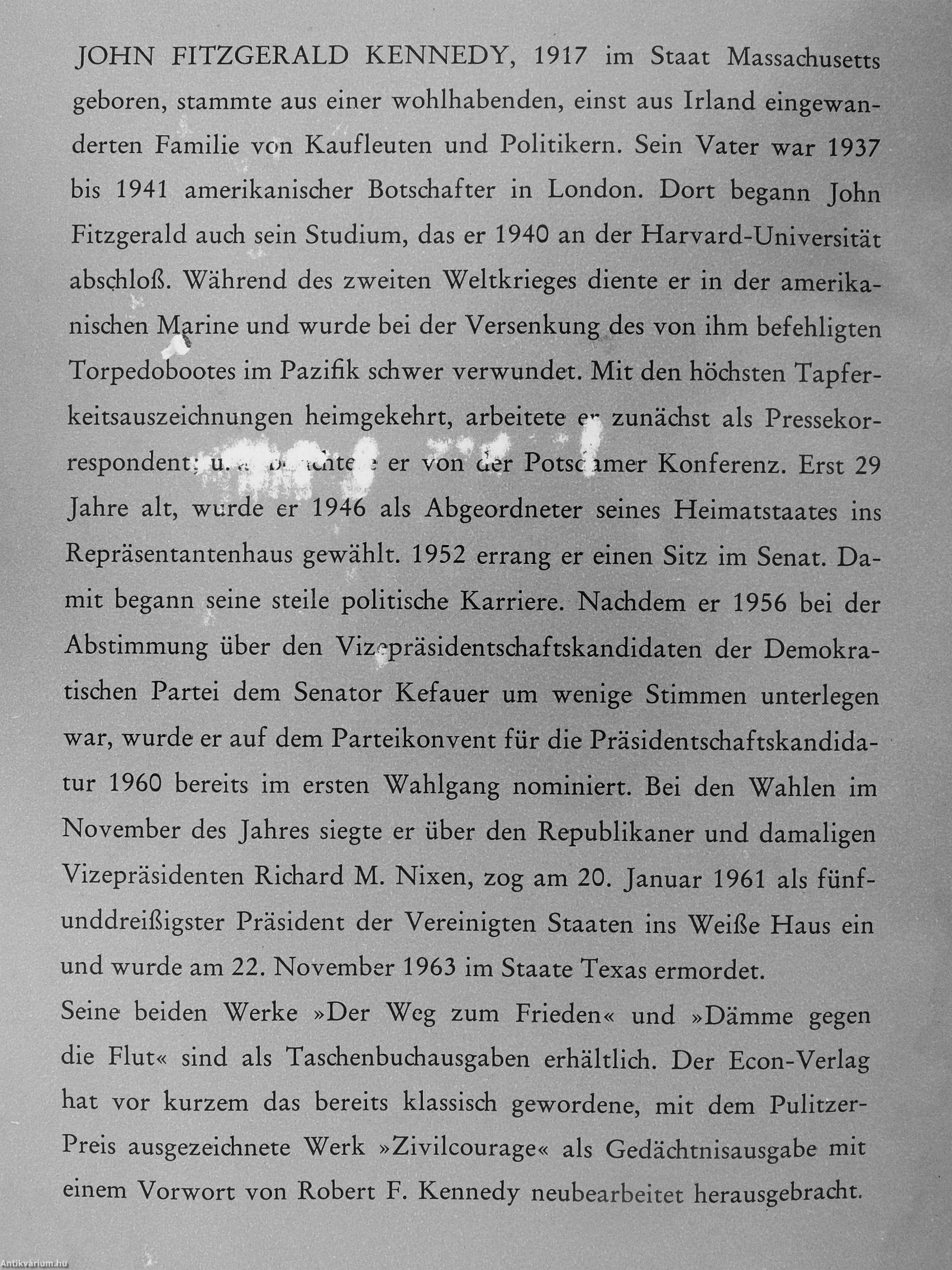 JOHN FITZGERALD KENNEDY, 1917 im Staat Massachusetts geboren, stammte aus einer wohlhabenden, einst aus Irland eingewanderten Familie von Kaufleuten und Politikern. Sein Vater war 1937 bis 1941 amerikanischer Botschafter in London. Dort begann John Fitzgerald auch sein Studium, das er 1940 an der Harvard-Universität abschloß. Während des zweiten Weltkrieges diente er in der amerikanischen Murine und wurde bei der Versenkung des von ihm befehligten Torpedobootes im Pazifik schwer verwundet. Mit den höchsten Tapferkeitsauszeichnungen heimgekehrt, arbeitete e-- zunächst als Pressekorrespondent,: u.i> ichte i er von der Potscimer Konferenz. Erst 29 Jahre alt, wurde er 1946 als Abgeordneter seines Heimatstaates ins Repräsentantenhaus gewählt. 1952 errang er einen Sitz im Senat. Damit begann seine steile politische Karriere. Nachdem er 1956 bei der Abstimmung über den Vizepräsidentschaftskandidaten der Demokratischen Partei dem Senator Kefauer um wenige Stimmen unterlegen war, wurde er auf dem Parteikonvent für die Präsidentschaftskandidatur 1960 bereits im ersten Wahlgang nominiert. Bei den Wahlen im November des Jahres siegte er über den Republikaner und damaligen Vizepräsidenten Richard M. Nixen, zog am 20. Januar 1961 als fünfunddreißigster Präsident der Vereinigten Staaten ins Weiße Haus ein und wurde am 22. November 1963 im Staate Texas ermordet. Seine beiden Werke »Der Weg zum Frieden« und »Dämme gegen die Flut« sind als Taschenbuchausgaben erhältlich. Der Econ-Verlag hat vor kurzem das bereits klassisch gewordene, mit dem Pulitzer-Preis ausgezeichnete Werk »Zivilcourage« als Gedächtnisausgabe mit einem Vorwort von Robert F. Kennedy neubearbeitet herausgebracht. Vissza