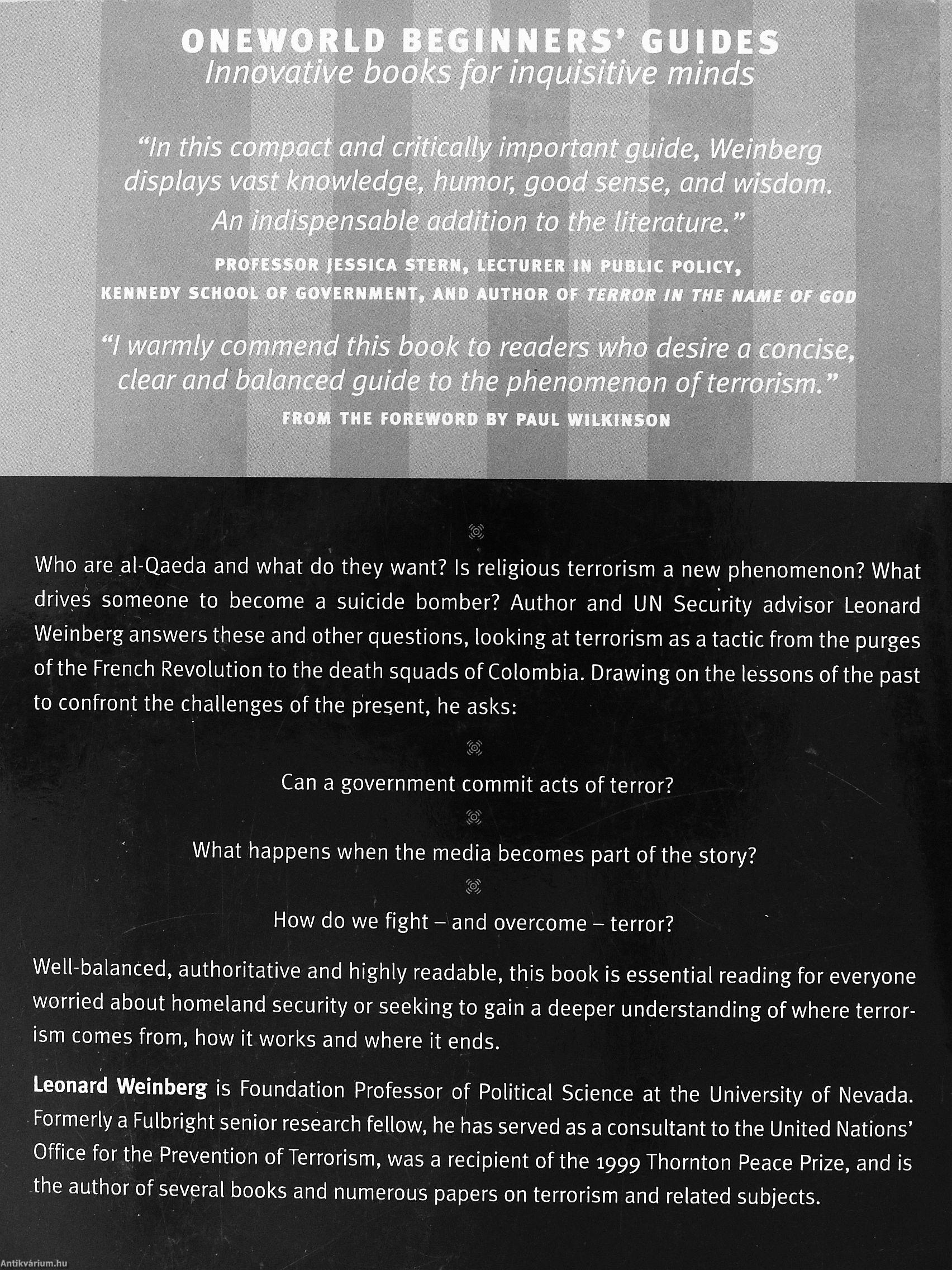 Who are al-Qaeda and what do they want? Is religious terrorism a new phenomenon? What drives someone to become a suicide bomber? Author and UN Security advisor Leonard Weinberg answers these and other questions, looking at terrorism as a tactic from the purges ofthe French Revolution to the death squads of Colombia. Drawing on the lessons ofthe past to confront the challenges ofthe present, he asks: