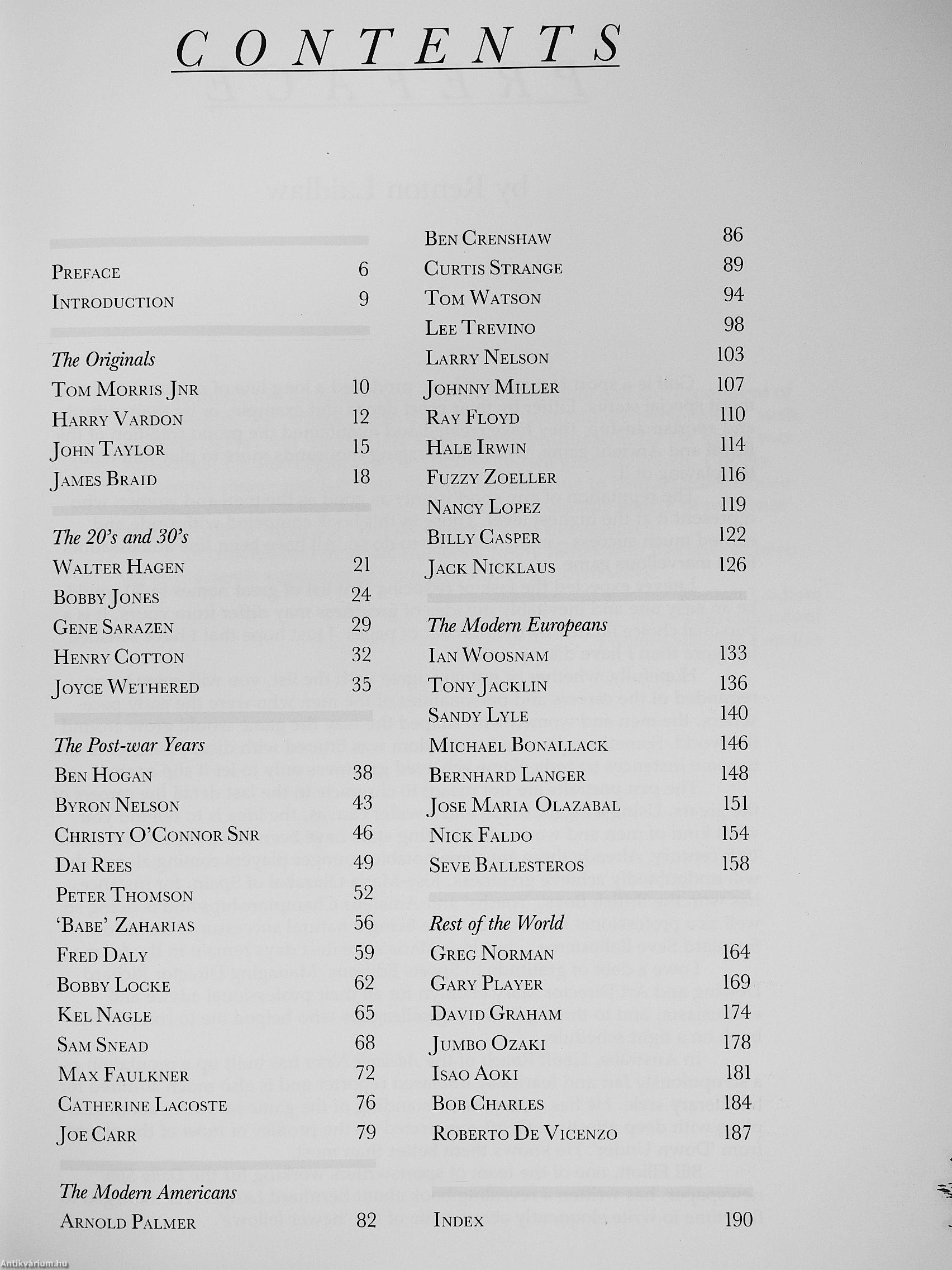All the great names are included, from the hard-working John Taylor, to the graceful stylist Peter Thomson; Nicklaus, the record-breaker, or the maverick, Trevino; from the legendary Arnold Palmer to the promising and hugely talented Jose-Maria Olazabal; Ballesteros the wizard to that pillar of consistency, Nick Faldo.