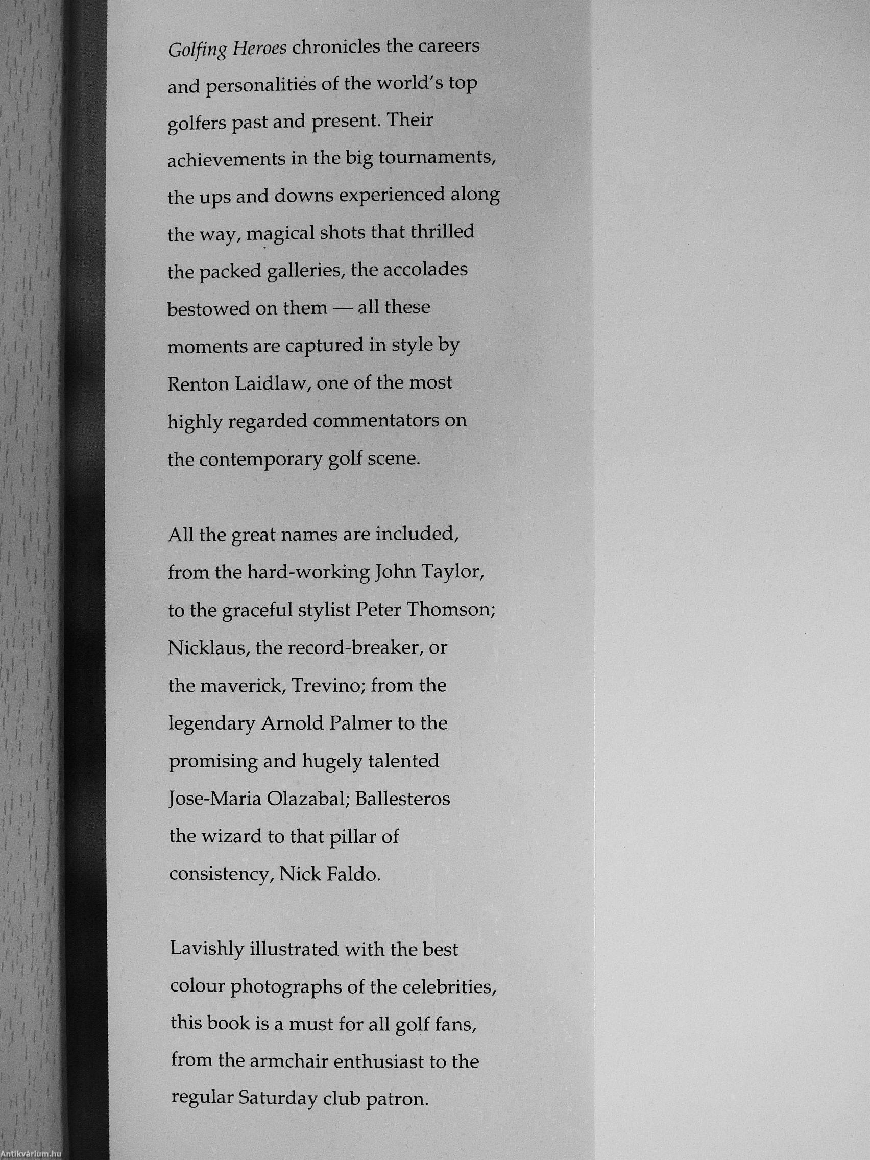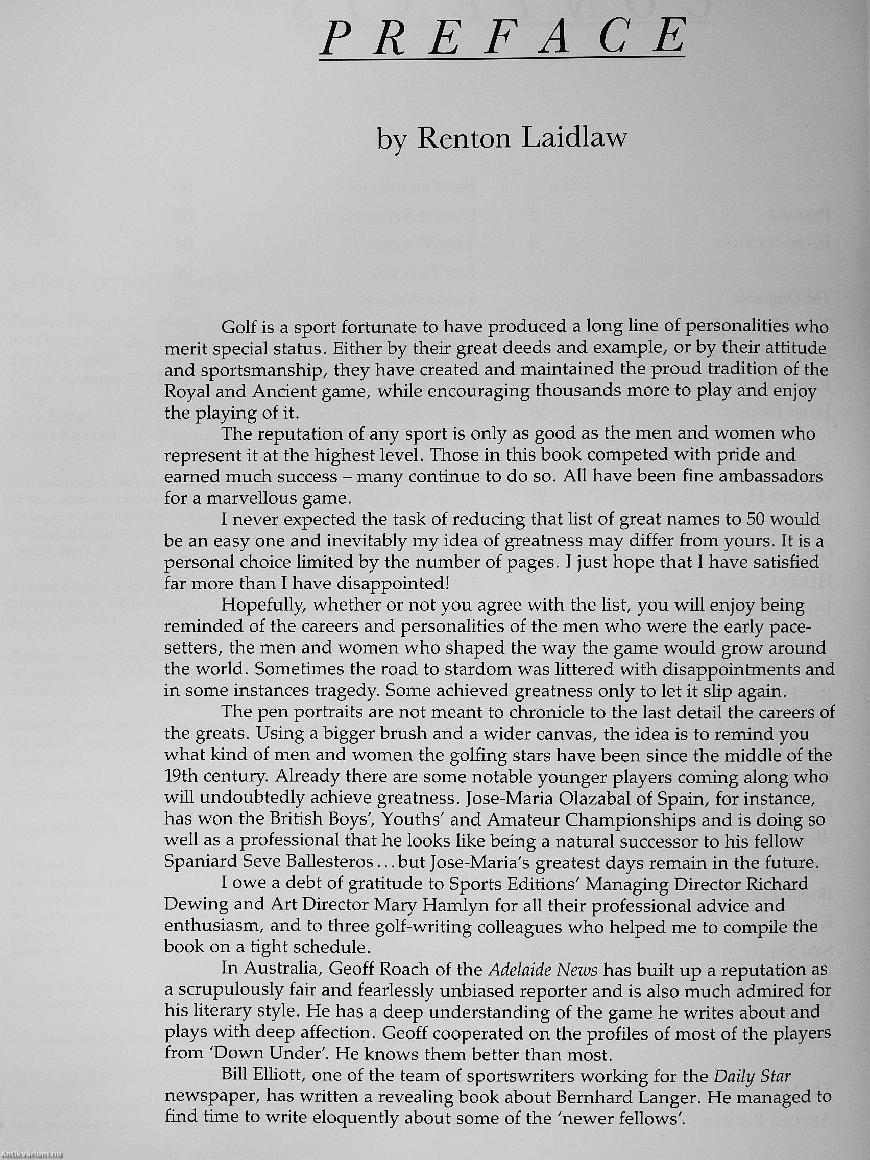 Ren ton Laidlaw's vivid text, accompanied by superb photographs, brings to life the heroes that have graced the international golf scene — from legends such as Arnold Palmer and Gary Player, through to contemporary masters such as Norman, Woosnam, Faldo and Ballesteros.