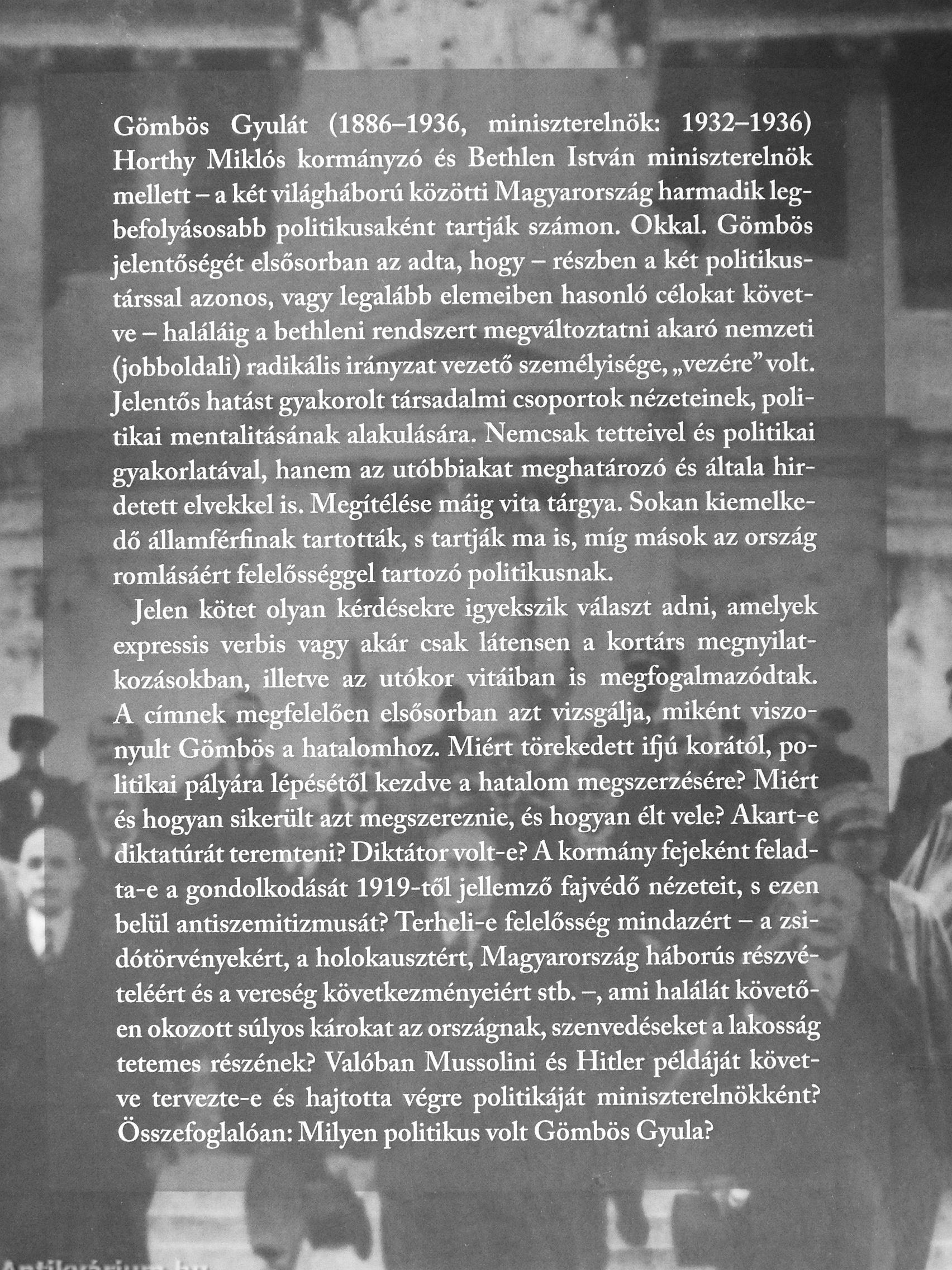 Jelen kötet olyan kérdésekre igyekszik választ adni, amelyek expressis verbis vagy akár csak látensen a kortárs megnyilatkozásokban, illetve az utókor vitáiban is megfogalmazódtak. A címnek megfelelően elsősorban azt vizsgálja, miként viszonyult Gömbös a hatalomhoz. Miért törekedett i^ú korától, politikai pályára lépésétől kezdve a hatalom megszerzésére? Miért és hogyan sikerült azt megszereznie, és hogyan élt vele? Akart-e diktatúrát teremteni? Diktátor volt-e? A kormány fejeként feladta-e a gondolkodását 1919-től jellemző fajvédő nézeteit, s ezen belül antiszemitizmusát? Terheli-e felelősség mindazért - a zsidótörvényekért, a holokausztért, Magyarország háborús részvételéért és a vereség következményeiért stb. -, ami halálát követően okozott súlyos károkat az országnak, szenvedéseket a lakosság tetemes részének? Valóban MussoÜni és Hitler példáját követve tervezte-e és hajtotta végre politikáját miniszterelnökként? Összefoglalóan: Müyen politikus volt Gömbös Gyula? Vissza
