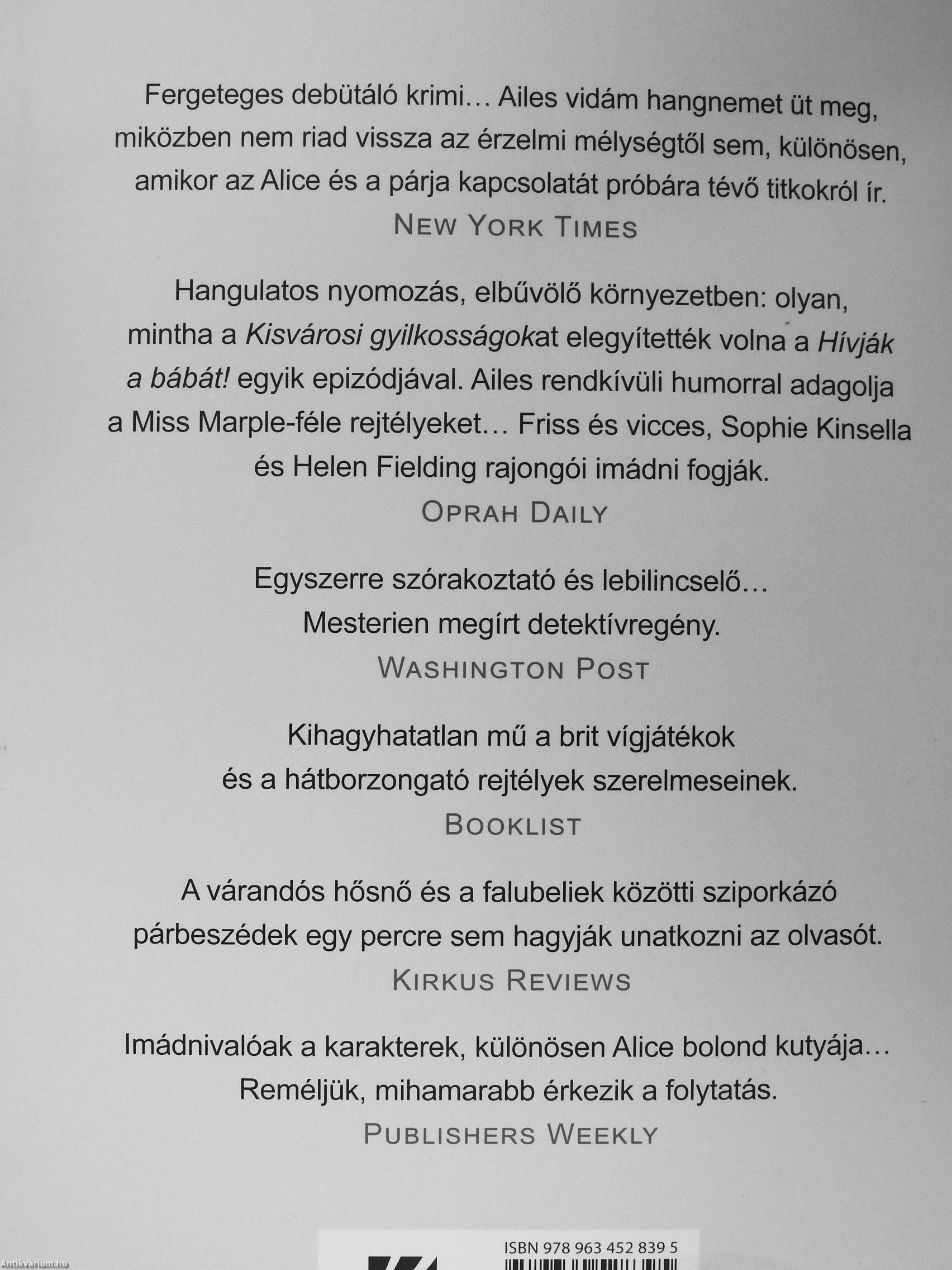 Hangulatos nyomozás, elbűvölő környezetben: olyan, mintha a Kisvárosi gy/7/cosságo/cat elegyítették volna a Hivják a bábát! egyik epizódjával. Ailes rendkívüli humorral adagolja a Miss Marple-féle rejtélyeket Friss és vicces, Sophie Kinsella és Helen Fielding rajongói imádni fogják. Oprah Daily