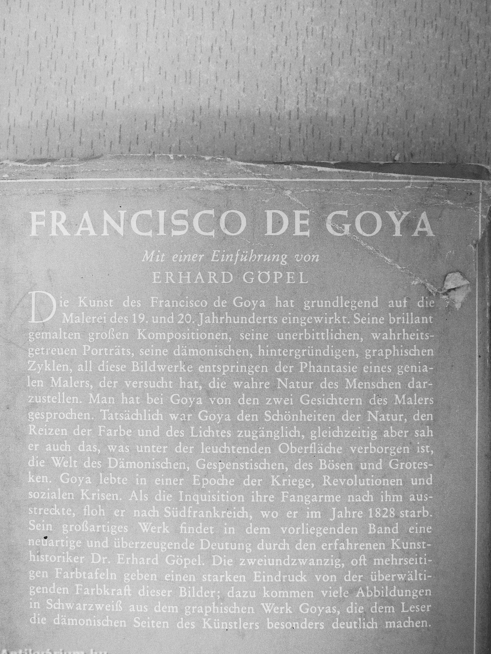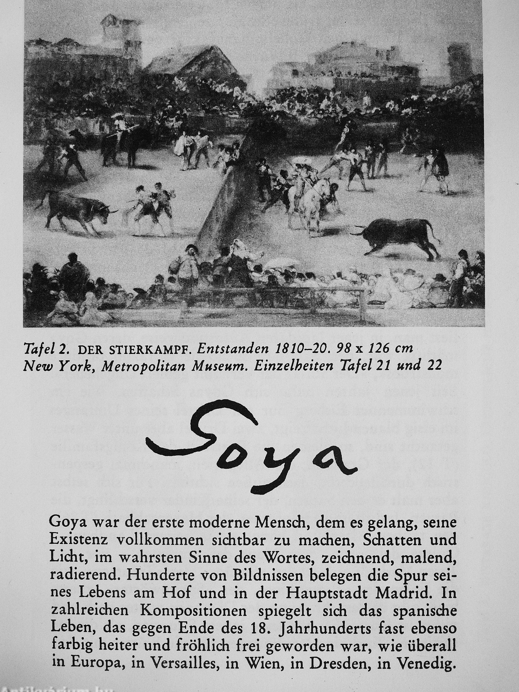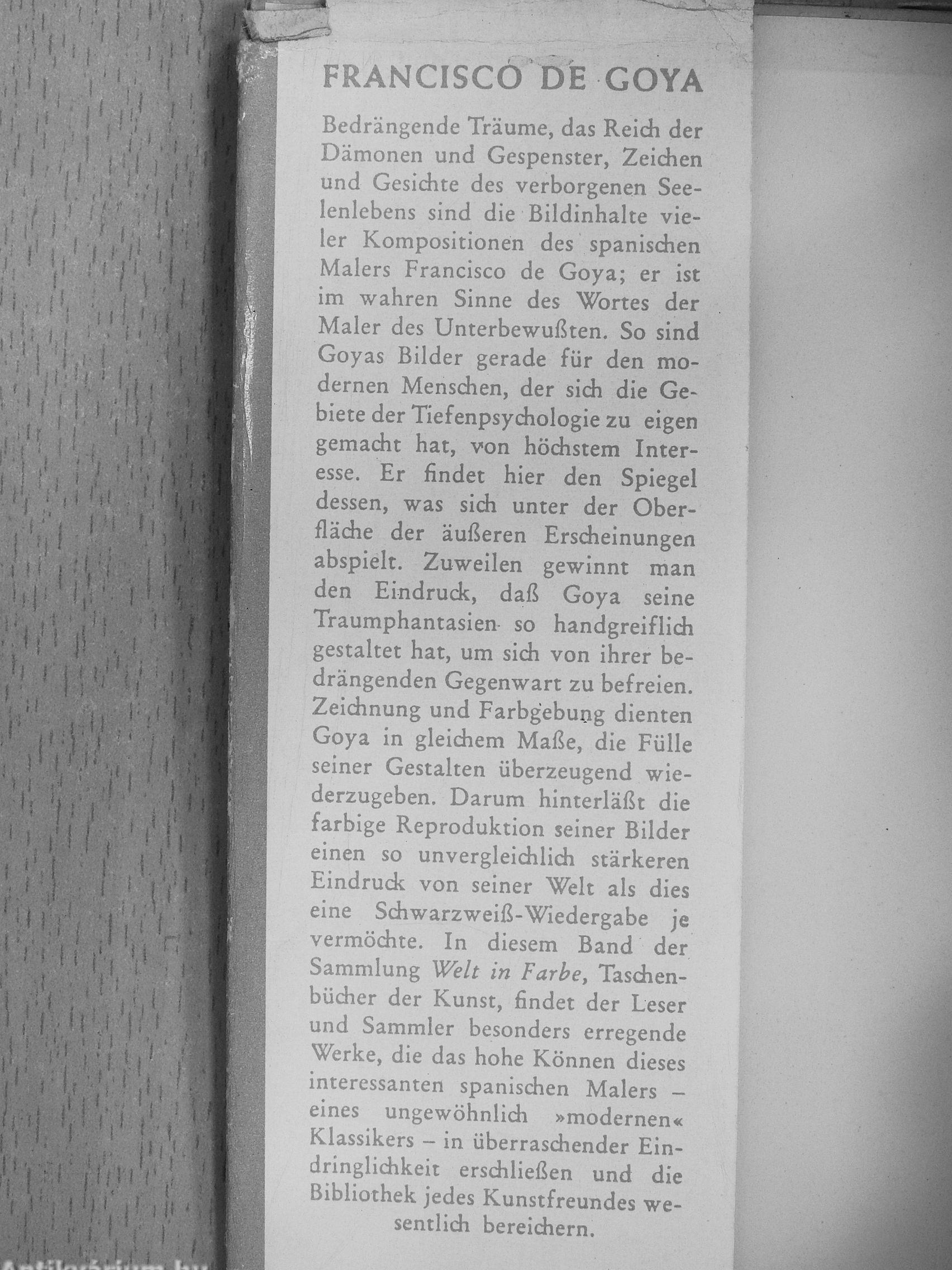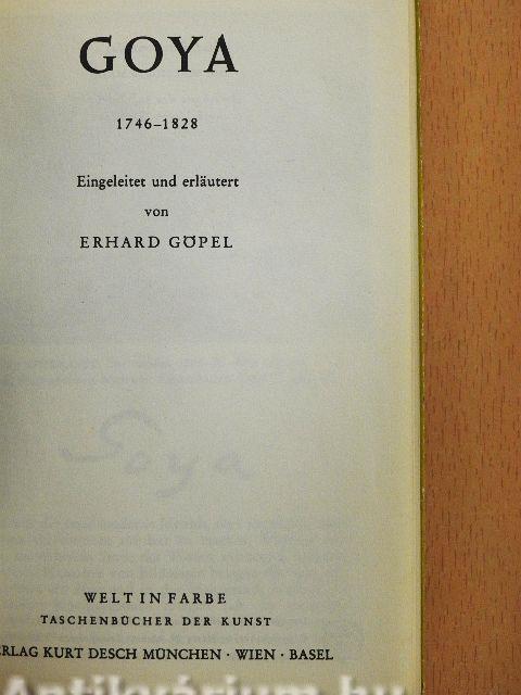 j ie Kunst des Francisco de Goya hat grundlegend aui die l^'ff . Malerei des 19. und 20. Jahrhunderts eingewirkt. Seine brillant gemalten großen Kompositionen, seine unerbittlichen, wahrheits- i. getreuen Porträts, seine dämonischen, hintergründigen, graphischen . Zyklen, all diese Bildwerke entspringen der Phantasie eines genialen Malers, der versucht hat, die wahre Natur des Menschen darzustellen. Man hat bei Goya von den zwei Gesiciitern des Malers gesprochen. Tatsächlidi war Goya den Schönheiten der Natur, den Reizen der Farbe und des Lichtes zugänglich, gleichzeitig aber sah er audh das, was unter der leiichtenden Oberfläche verborgen ist, die "Welt des Dämonischen, Gespenstischen, des Bösen und Grotesken. Goya lebte in einer Epoche der Kriege, Revolutionen und sozialen Krisen. Als die Inquisition ihre Fangarme nach ihm aus-stredte, floh er nacJi Südfrankreidi, wo er im Jahre 1828 starb. , Sein großartiges Werk...