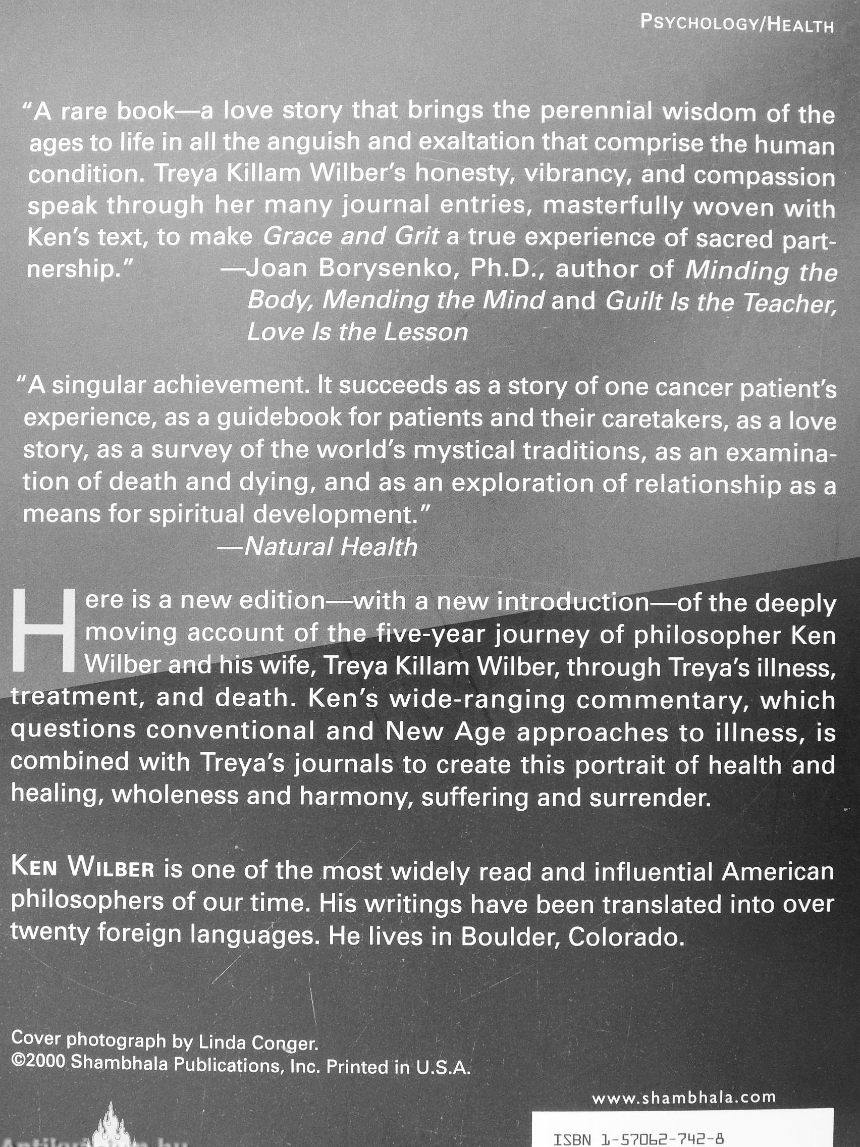 "A rare book—a love story that brings the perennial wisdom of the ages to life In all the anguish and exaltation that comprise the human condition. Treya Killam Wilber's honesty, vibrancy, and compassion speak through her many journal entries, masterfully woven with Ken's text, to make Grace and Grit a true experience of sacred partnership." —Joan Borysenko, Ph.D., author of Minding the Body, Mending the Mind and Guilt Is the Teacher, Love Is the Lesson