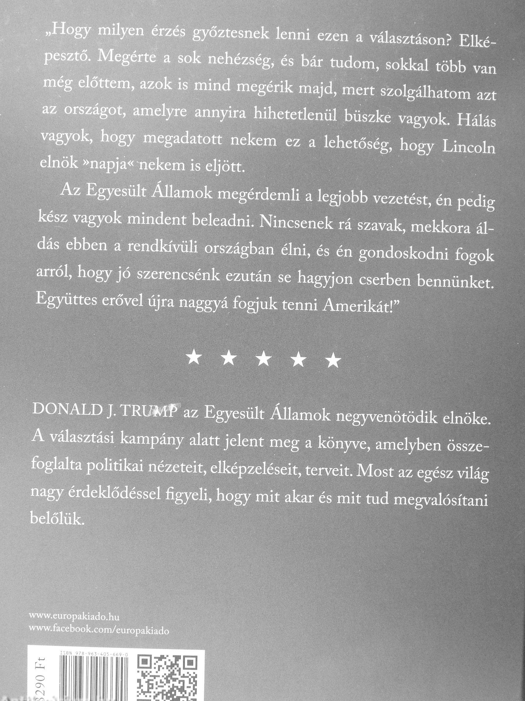DONALD J. TRUMf az Egyesült Államok negyvenötödik elnöke. A választási kampány alatt jelent meg a könyve, amelyben összefoglalta politikai nézeteit, elképzeléseit, terveit. Most az egész világ nagy érdeklődéssel figyeli, hogy mit akar és mit tud megvalósítani belőlük.