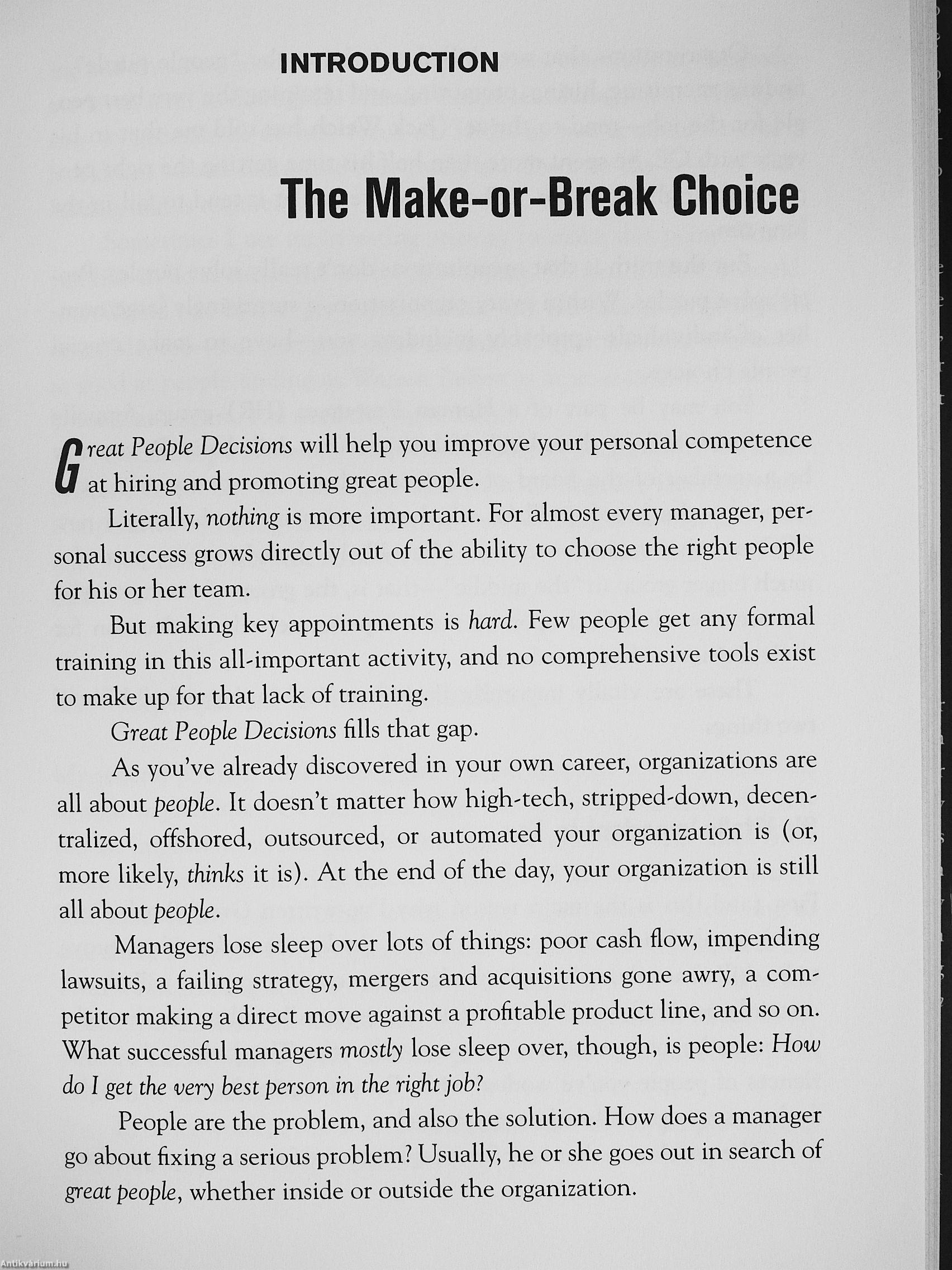But for most people, making great appointments is difficult, time-consuming, and even scary. Few have received any formal training in it, and there are very few resources available to make up for that lack of training. This book fills that gap. It provides the conceptual background and the practical, everyday tools needed to make consistently successful hiring decisions. Great People Decisions is a comprehensive resource for managers who vyant to improve their personal competence at hiring and promoting people, and also for students interested in the field. Yes, hiring is difficult, but it isn't a mystery. It's a discipline that you can master—to help your organization, and to help yourself.