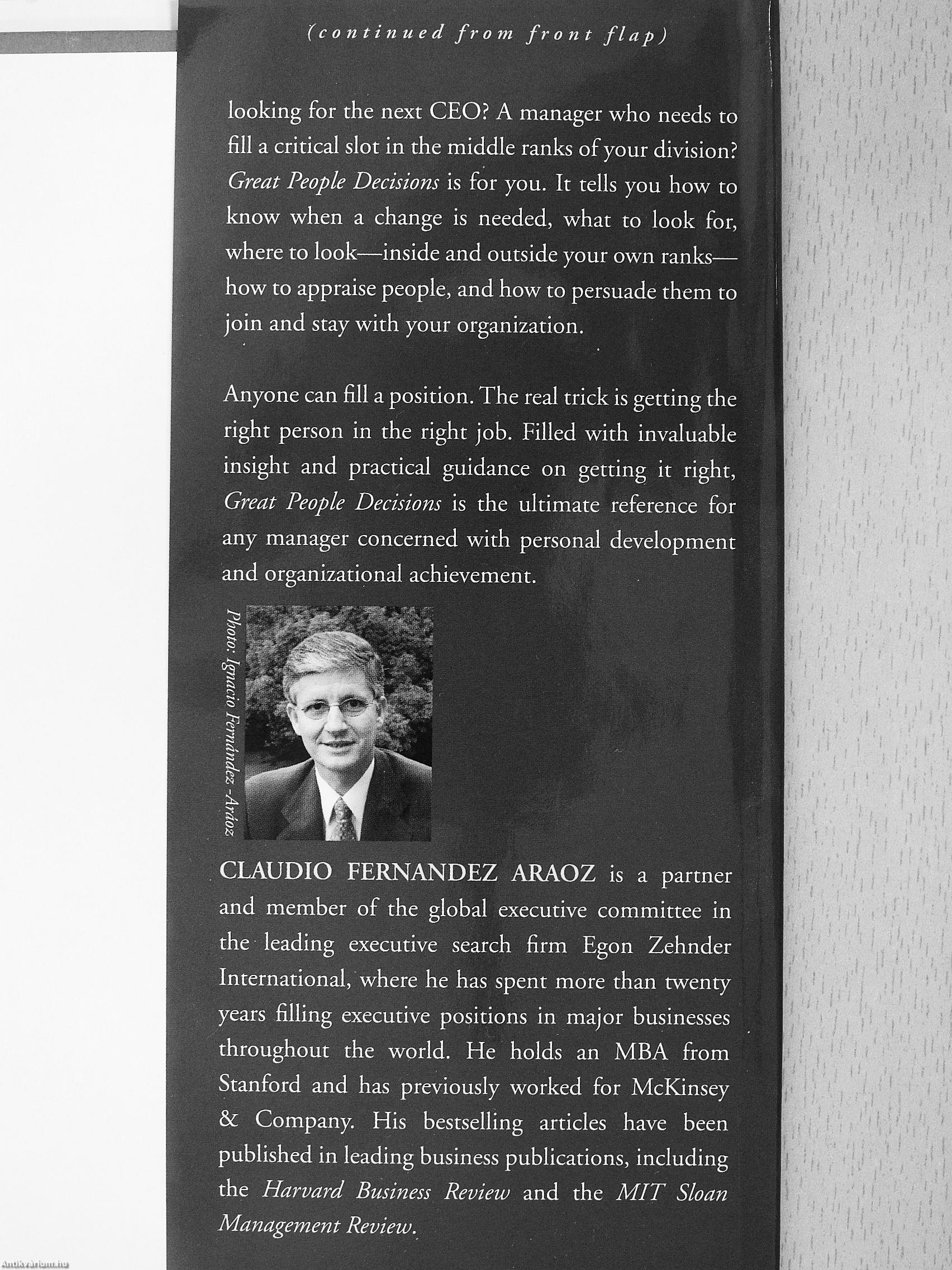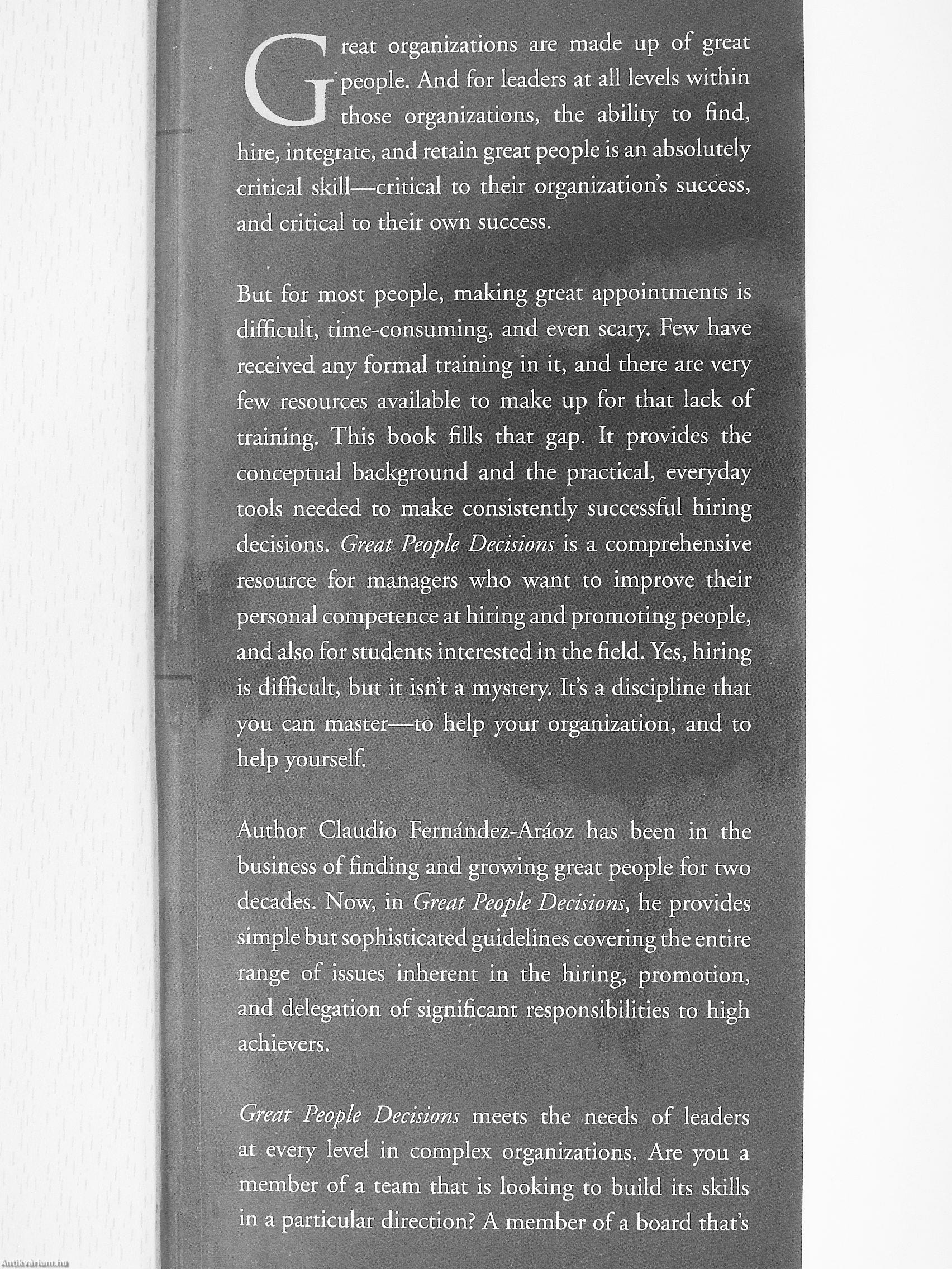 Author Claudio Fernandez-Araoz has been in the business of finding and growing great people for two decades. Now, in Great People Decisions, he provides simple but sophisticated guidelines covering the entire range of issues inherent in the hiring, promotion, and delegation of significant responsibilities to high