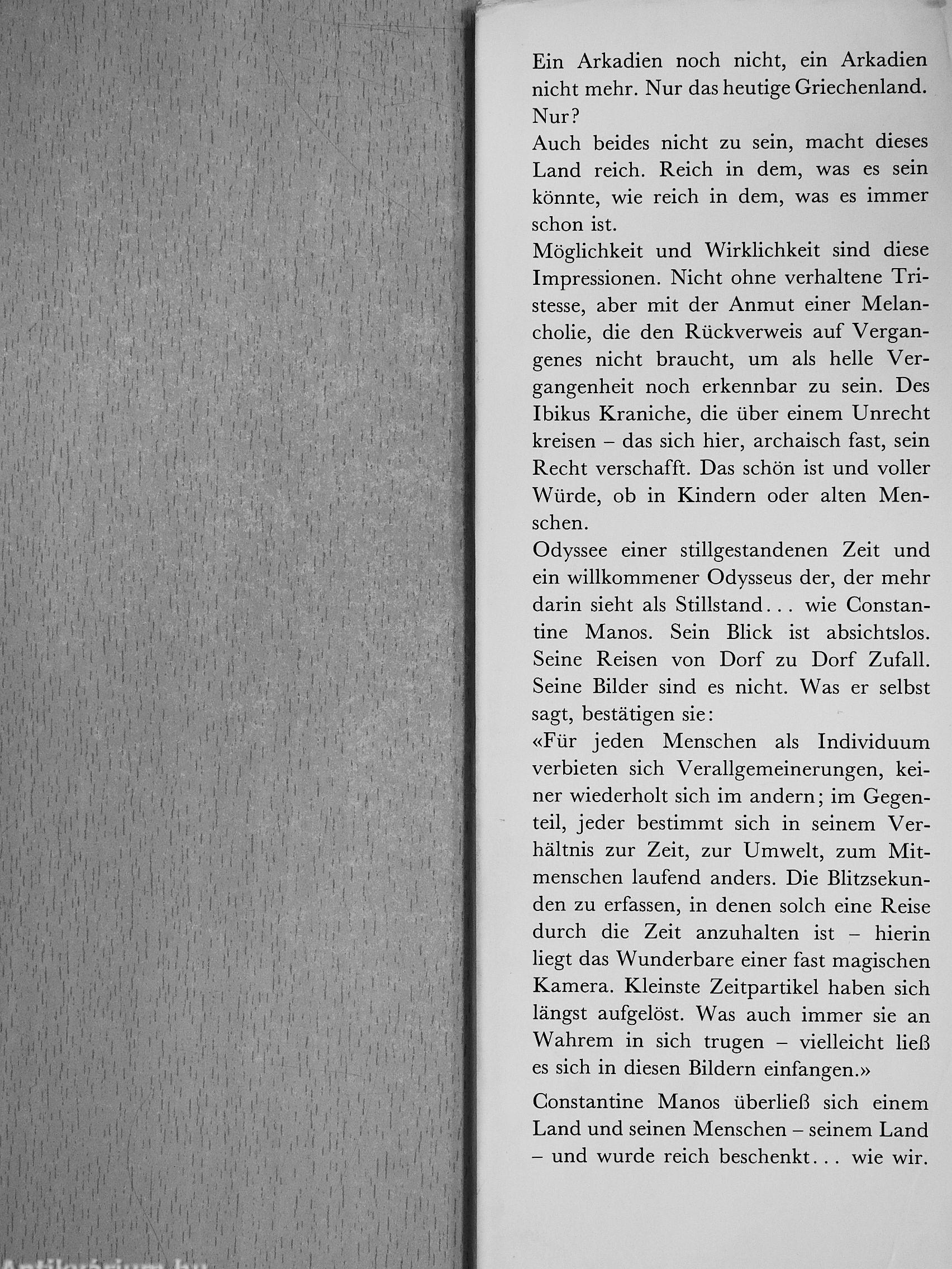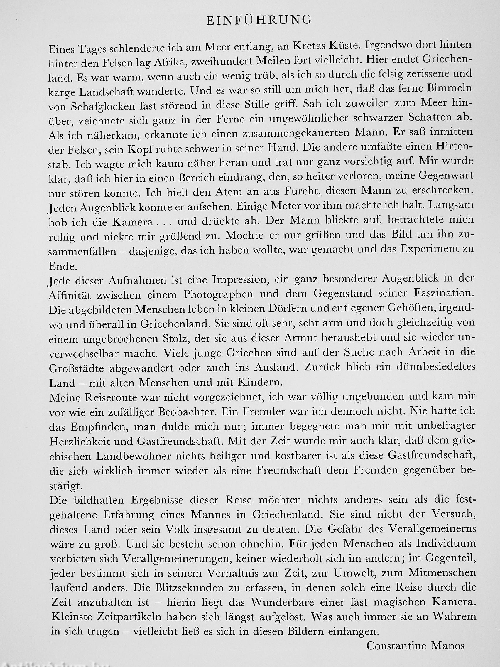 «Für jeden Menschen als Individuum verbieten sich Verallgemeinerungen, keiner wiederholt sich im andern; im Gegenteil, jeder bestimmt sich in seinem Verhältnis zur Zeit, zur Umwelt, zum Mitmenschen laufend anders. Die Blitzsekunden zu erfassen, in denen solch eine Reise durch die Zeit anzuhalten ist - hierin liegt das Wunderbare einer fast magischen Kamera. Kleinste Zeitpartikel haben sich längst aufgelöst. Was auch immer sie an Wahrem in sich trugen - vielleicht ließ es sich in diesen Bildern einfangen.» Constantine Manos überließ sich einem Land und seinen Menschen - seinem Land - und wurde reich beschenkt. . . wie wir. Vissza