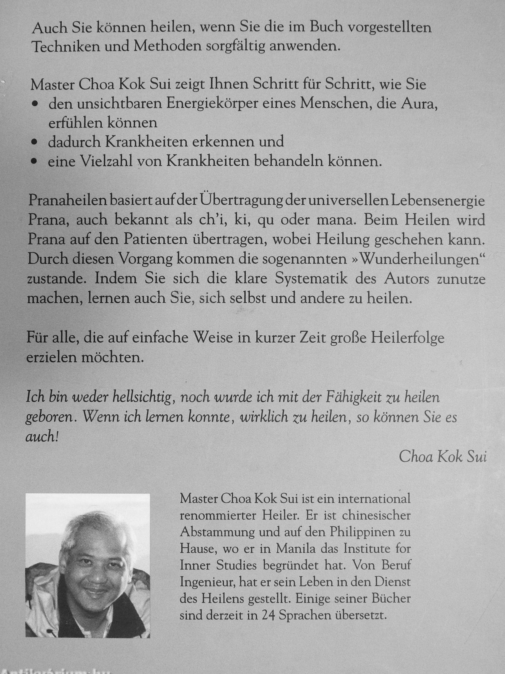 Master Choa Kok Sui ist ein international renommierter Heiler. Er ist chinesischer Abstammung und auf den Philippinen zu Hause, wo er in Manila das Institute for Inner Studies begründet hat. Von Beruf Ingenieur, hat er sein Leben in den Dienst des Heilens gestellt. Einige seiner Bücher sind derzeit in 24 Sprachen übersetzt.