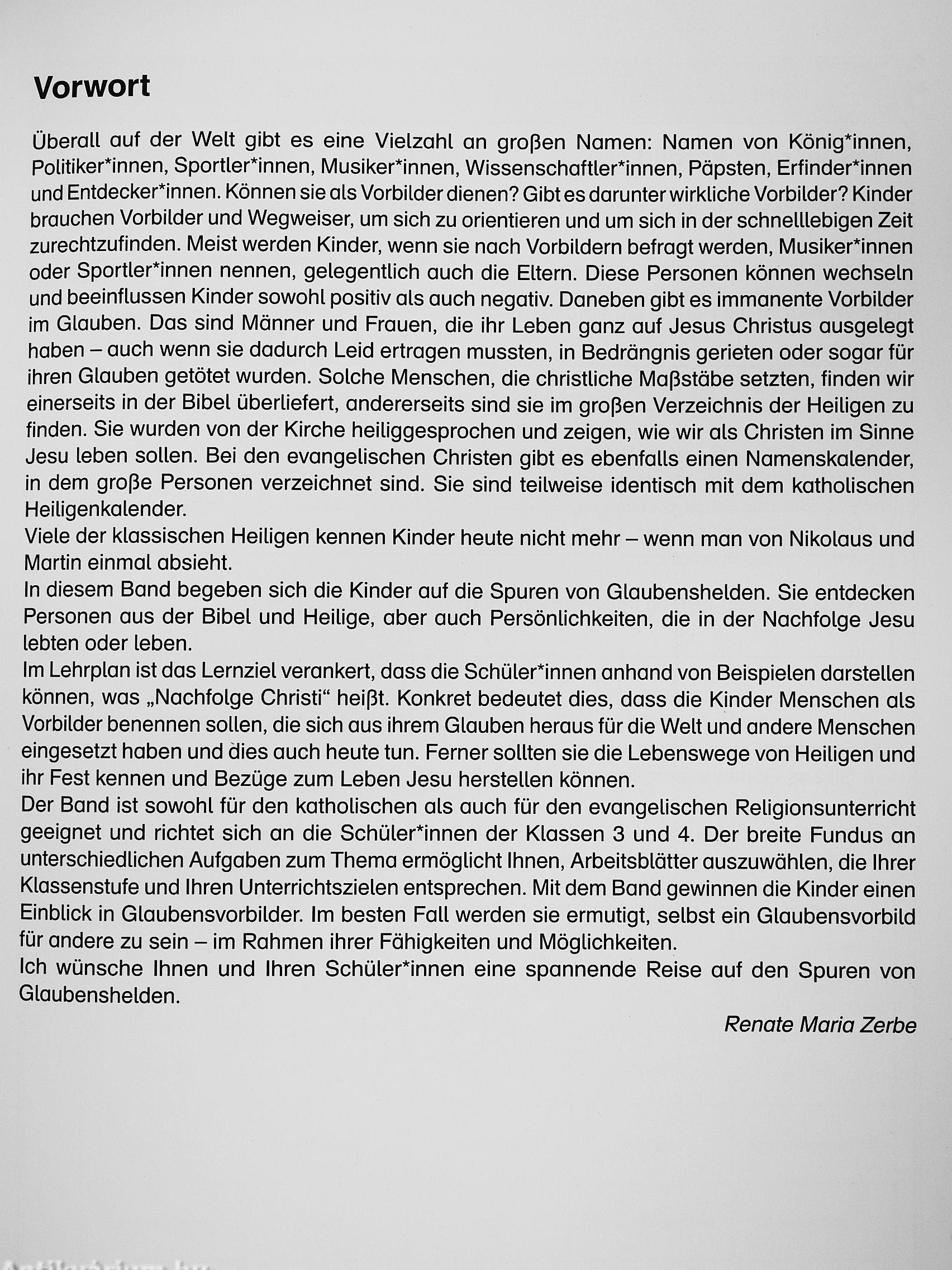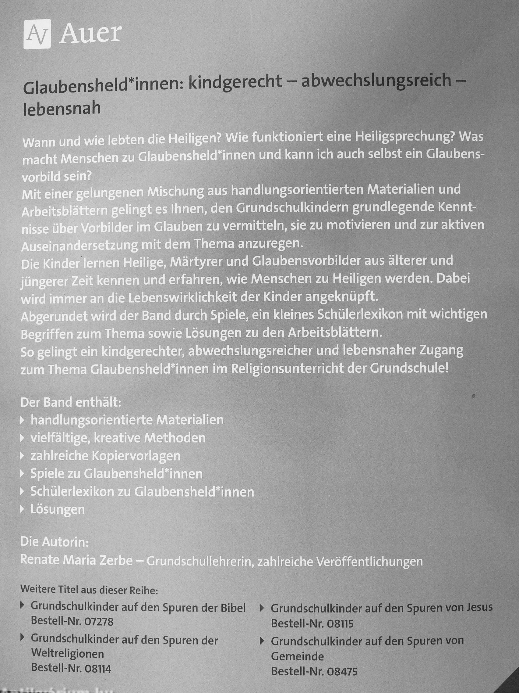 Die Kinder lernen Heilige, Märtyrer und Glaubensvorbilder aus älterer und jüngerer Zeit kennen und erfahren, wie Menschen zu Heiligen werden. Dabei wird immer an die Lebenswirklichkeit der Kinder angeknüpft. Abgerundet wird der Band durch Spiele, ein kleines Schülerlexikon mit wichtigen Begriffen zum Thema sowie Lösungen zu den Arbeitsblättern. Fv So gelingt ein kindgerechter, abwechslungsreicher und lebensnaher Zugang zum Thema Glaubensheld*innen im Religionsunterricht der Grundschule!