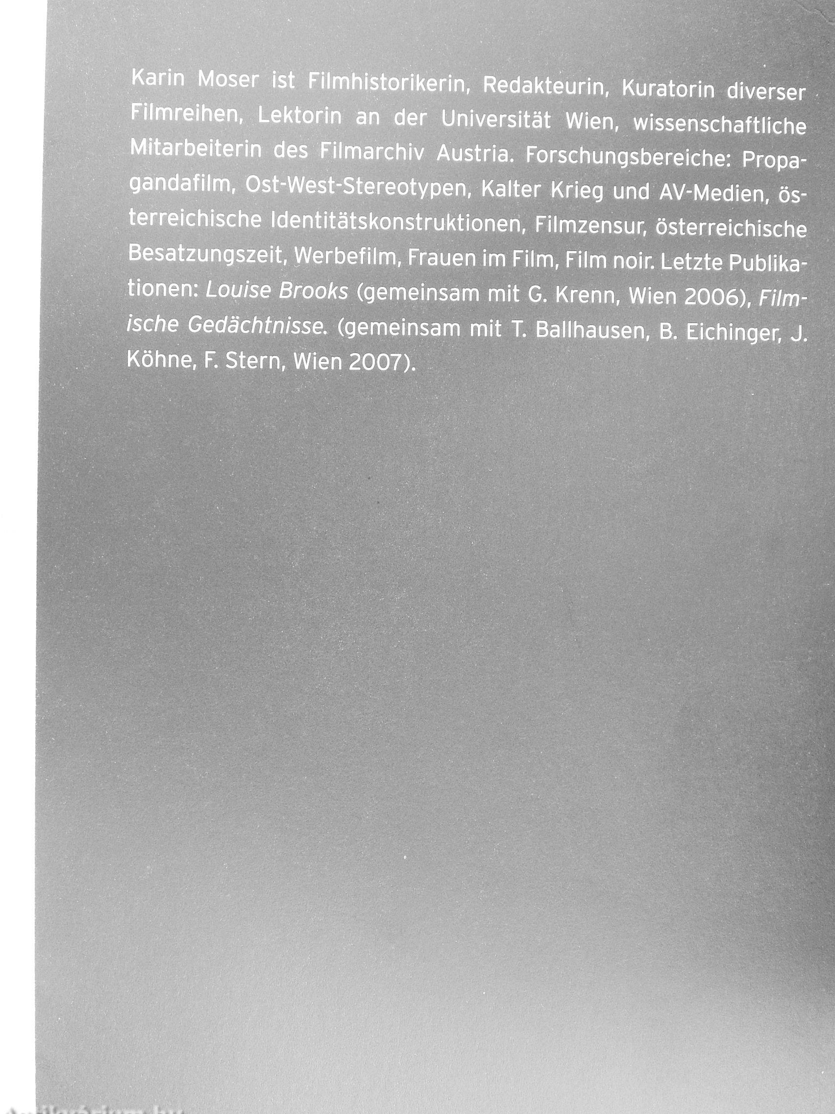 Karin Moser ist Filmhistorikerin, Redakteurin, Kuratorin diverser Filmreihen, Lektorin an der Universität Wien, wissenschaftliche Mitarbeiterin des Filmarchiv Austria. Forschungsbereiche: Propagandafilm, Ost-West-Stereotypen, Kalter Krieg und AV-Medien, österreichische Identitätskonstruktionen, Filmzensur, österreichische Besatzungszeit, Werbefilm, Frauen im Film, Film noir. Letzte Publikationen: Louise Brooks (gemeinsam mit G. Krenn, Wien 2006), Filmische Gedächtnisse, (gemeinsam mit T. Ballhausen, B. Eichinger, J. Köhne, F. Stern, Wien 2007).