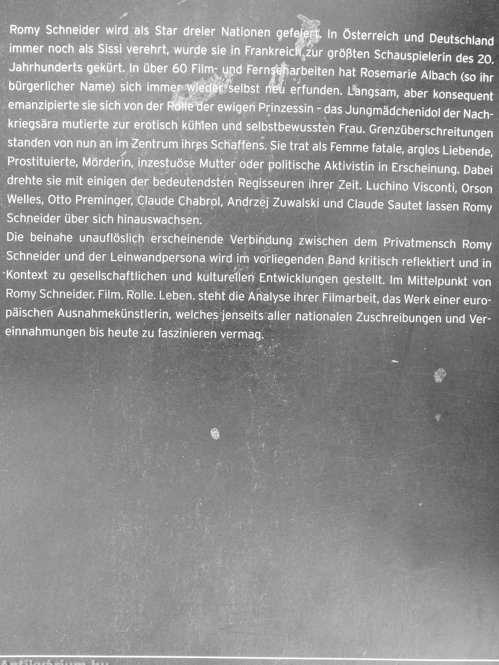 Die beinahe unauflöslich erscheinendie Verbindung zwischen dem Privatmensch Romy Schneider und der Leinwandpersona wird irh vorliegenden Band kritisch reflektiert und in -Kontext zu gesellschaftlichen und kultureilen Entwicklungen gestellt. Im Mittelpunkt von Romy Schneider. Film. Rolle. Leben, steht die Artalyse ihrer Filmarbeit, das Werk einer europäischen Ausnahmekünstlerin, Weiches jenseits aller nationalen Zuschreibungen und Vereinnahmungen bis heute zu faszinieren vermag. .