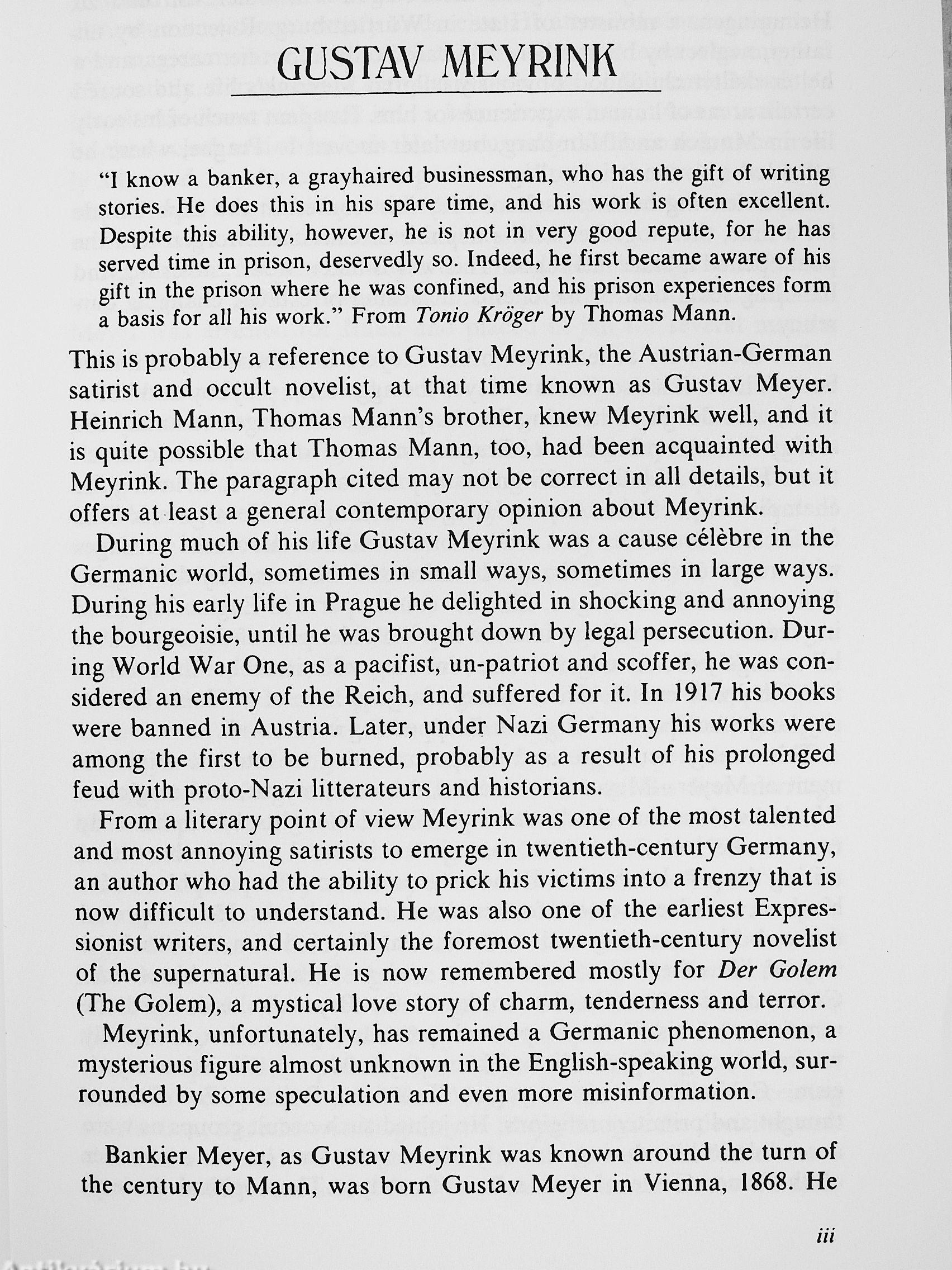This is the first meeting of Athanasius Pernath, gem-cutter with a shadow in his past, with the Golem, the strange supernatural force reputed to haunt the ancient Ghetto of Prague. From this meeting grows an incredible web of experiences, set within the twisted crumbling walls and dark passages of the Ghetto around the turn of the century. Strange mystical visions, wonderful transformations, lurking terrors and perplexing revelations come into being around the twin personalities of Pernath and the Golem, against a background of hatred and frustrated love, malice and cabalistic saintliness.