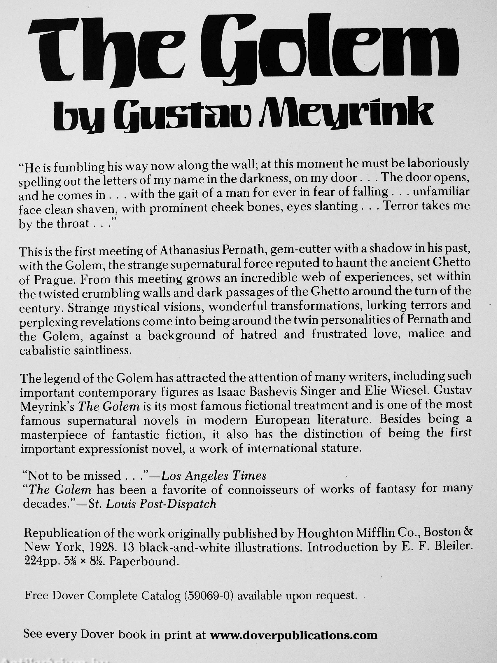 This is the first meeting of Athanasius Pernath, gem-cutter with a shadow in his past, with the Golem, the strange supernatural force reputed to haunt the ancient Ghetto of Prague. From this meeting grows an incredible web of experiences, set within the twisted crumbling walls and dark passages of the Ghetto around the turn of the century. Strange mystical visions, wonderful transformations, lurking terrors and perplexing revelations come into being around the twin personalities of Pernath and the Golem, against a background of hatred and frustrated love, malice and cabalistic saintliness....