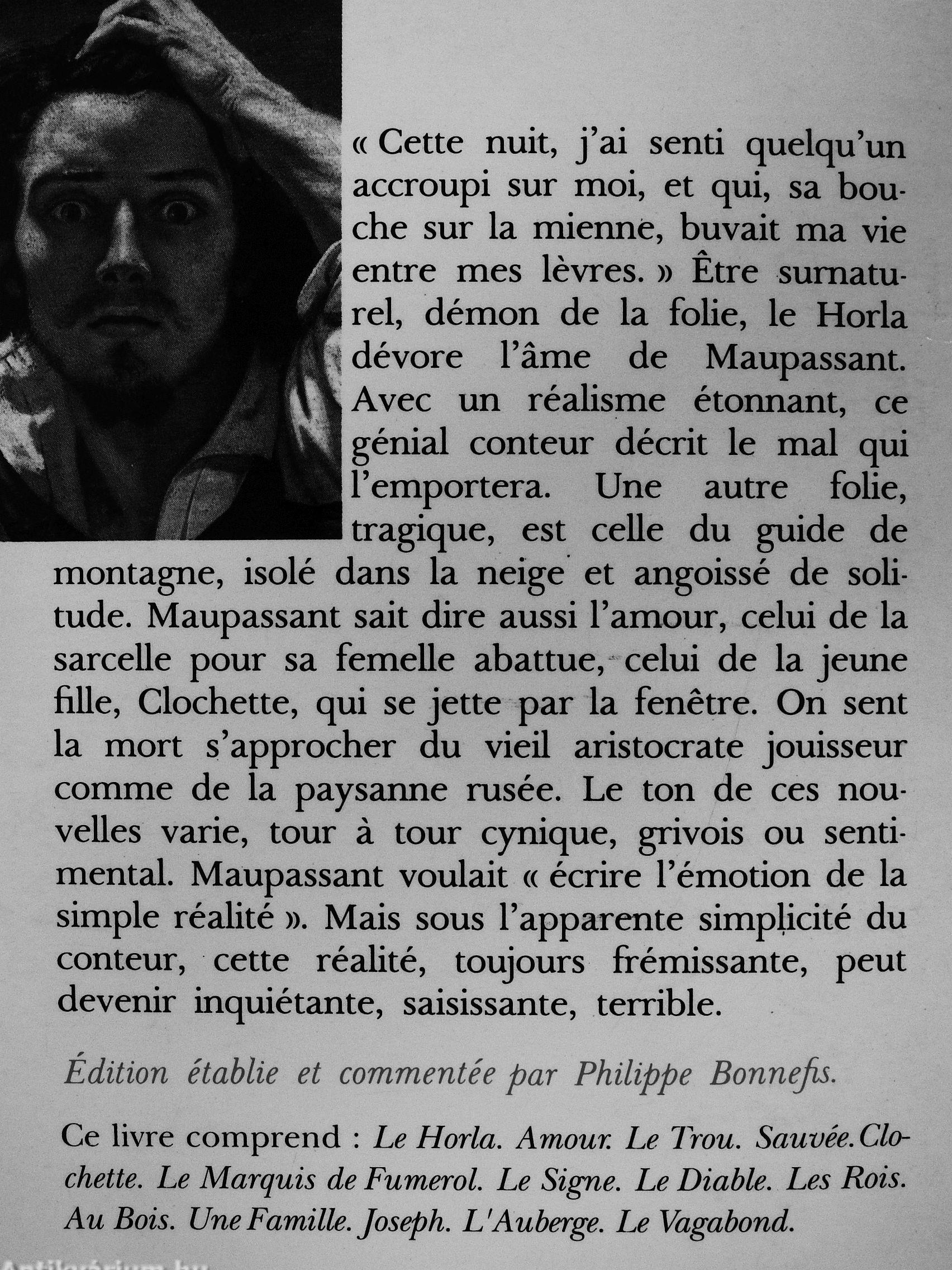 (( Cette nuit, j'ai senti quelqu'un accroupi sur moi, et qui, sa bouche sur la mienne, buvait ma vie entre mes levres. » Etre surnaturel, démon de la folie, le Horla dévore l'âme de Maupassant Avec un réalisme étonnant, ce génial conteur décrit le mal qui l'emportera. Une autre folie, tragique, est celle du guide de montagne, isolé dans la neige et angoissé de solitude. Maupassant sait dire aussi l'amour, celui de la sarcelle pour sa femelle abattue, celui de la jeune fille, Clochette, qui se jette par la fenetre. On sent la mort s'approcher du vieil aristocrate jouisseur comme de la paysanne rusée. Le ton de ces nouvelles varie, tour a tour cynique, grivois ou sentimental. Maupassant voulait « écrire l'émotion de la simple réalité ». Mais sous l'apparente simplicité du conteur, cette réalité, toujours firémissante, peut devenir inquiétante, saisissante, terrible.