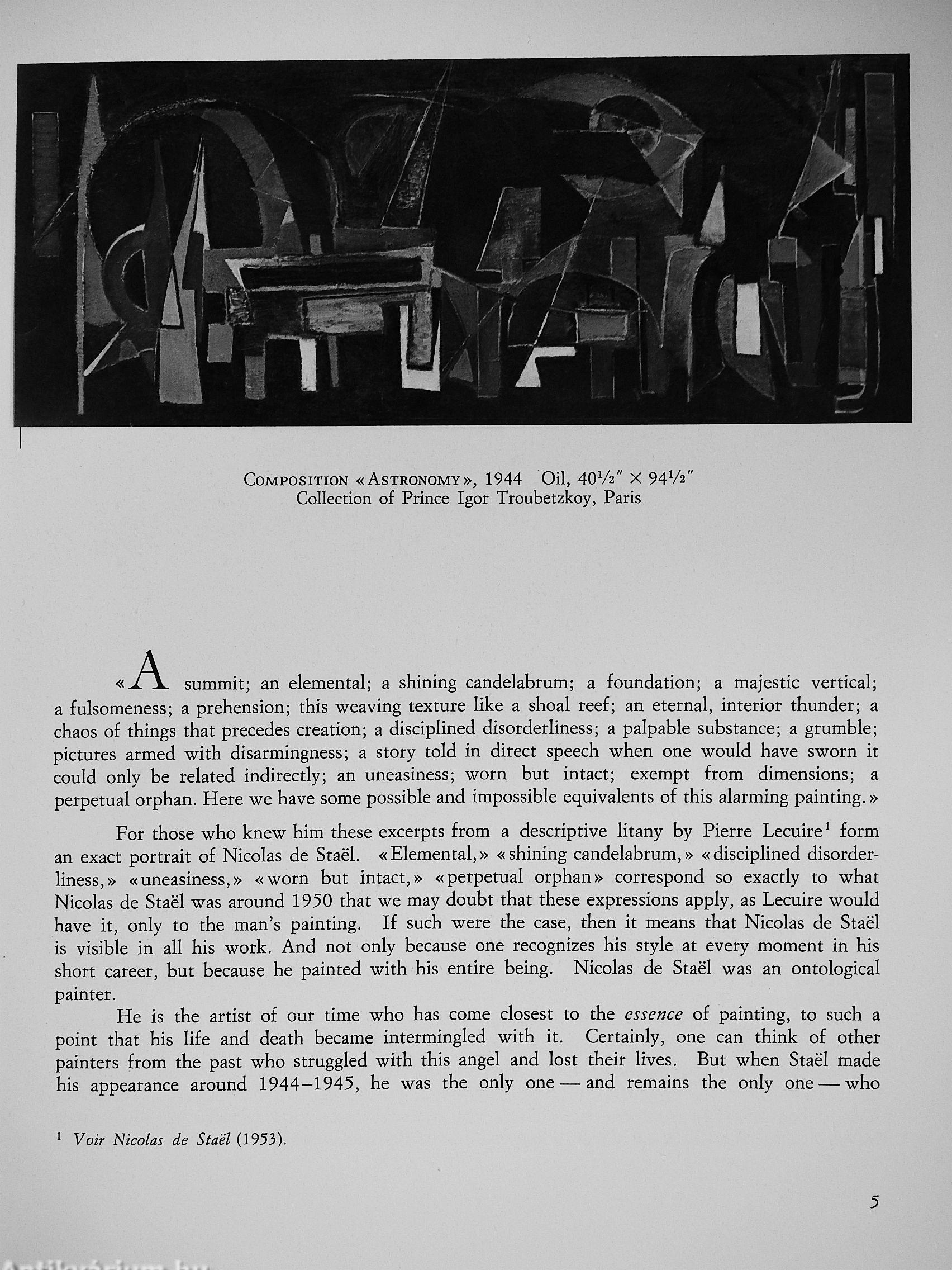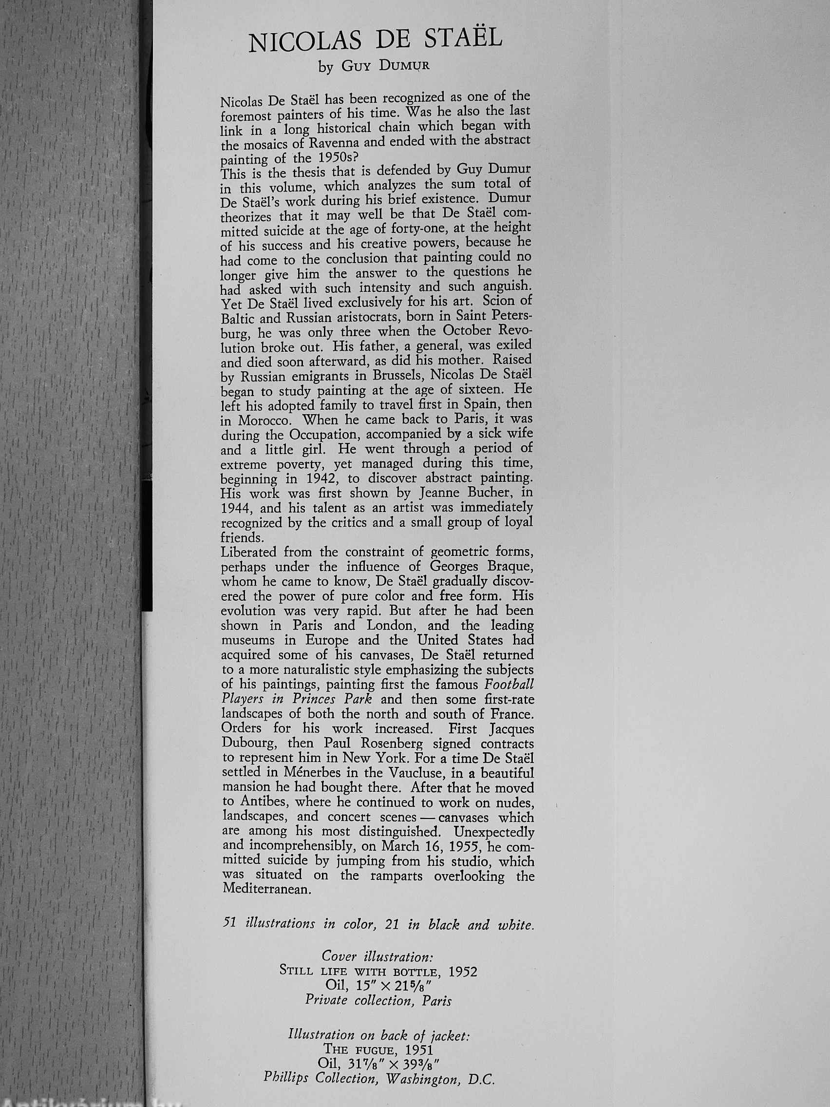 This is the thesis that is defended by Guy Dumur in this volume, which analyzes the sum total of De Staël's work during his brief existence. Dumur theorizes that it may well be that De Staël committed suicide at the age of forty-one, at the height of his success and his creative powers, because he had come to the conclusion that painting could no longer give him the answer to the questions he had asked with such intensity and such anguish. Yet De Staël lived exclusively for his art. Scion of Baltic and Russian aristocrats, born in Saint Petersburg, he was only three when the October Revolution broke out. His father, a general, was exiled and died soon afterward, as did his mother. Raised by Russian emigrants in Brussels, Nicolas De Staël began to study painting at the age of sbîteen. He left his adopted family to travel first in Spain, then in Morocco. When he came back to Paris, it was during the Occupation, accompanied by a sick wife and a little girl. He went through a period of extreme poverty, yet managed during this time, beginning in 1942, to discover abstract painting. His work was first shown by Jeanne Bucher, in 1944, and his talent as an artist was immediately recognized by the critics and a small group of loyal friends.