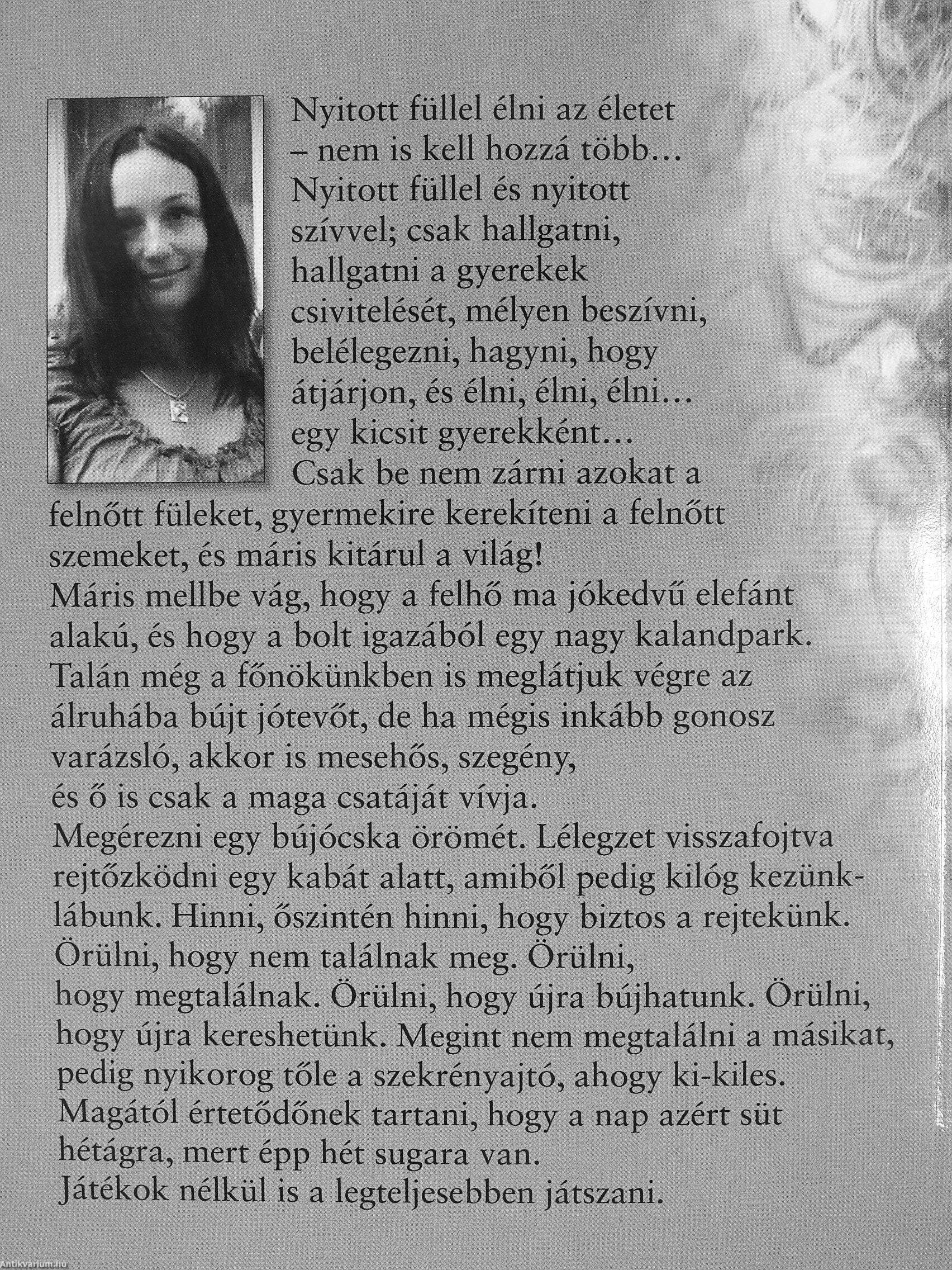 Nyitott füllel élni az életet - nem is kell hozzá több Nyitott füllel és nyitott szívvel; csak hallgatni, hallgatni a gyerekek csivitelését, mélyen beszívni, belélegezni, hagyni, hogy átjárjon, és élni, élni, élni egy kicsit gyerekként Csak be nem zárni azokat a felnőtt füleket, gyermekire kerekíteni a felnőtt szemeket, és máris kitárul a világ! Máris mellbe vág, hogy a felhő ma jókedvű elefánt alakú, és hogy a bolt igazából egy nagy kalandpark. Talán még a főnökünkben is meglátjuk végre az álruhába bújt jótevőt, de ha mégis inkább gonosz varázsló, akkor is mesehős, szegény, és ő is csak a maga csatáját vívja. Megérezni egy bújócska örömét. Lélegzet visszafojtva rejtőzködni egy kabát alatt, amiből pedig kilóg kezünklábunk. Hinni, őszintén hinni, hogy biztos a rejtekünk. Örülni, hogy nem találnak meg. Örülni, hogy megtalálnak. Örülni, hogy újra bújhatunk. Örülni, hogy újra kereshetünk. Megint nem megtalálni a másikat, pedig nyikorog tőle a szekrényajtó, ahogy ki-kiles. Magától értetődőnek tartani, hogy a nap azért süt hétágra, mert épp hét sugara van. Játékok nélkül is a legteljesebben játszani.