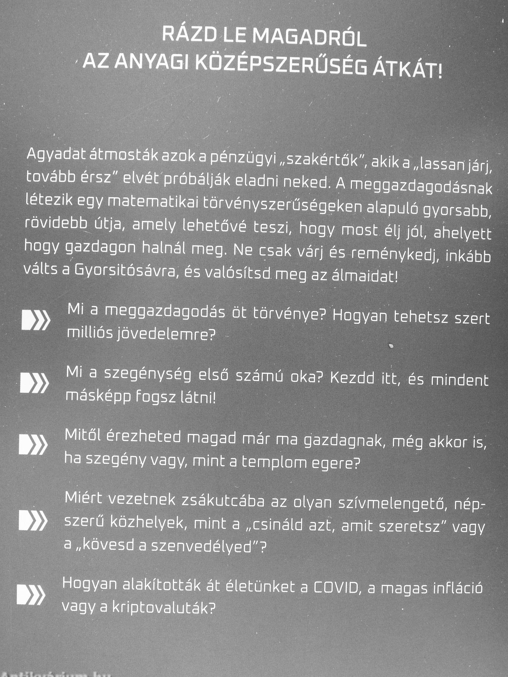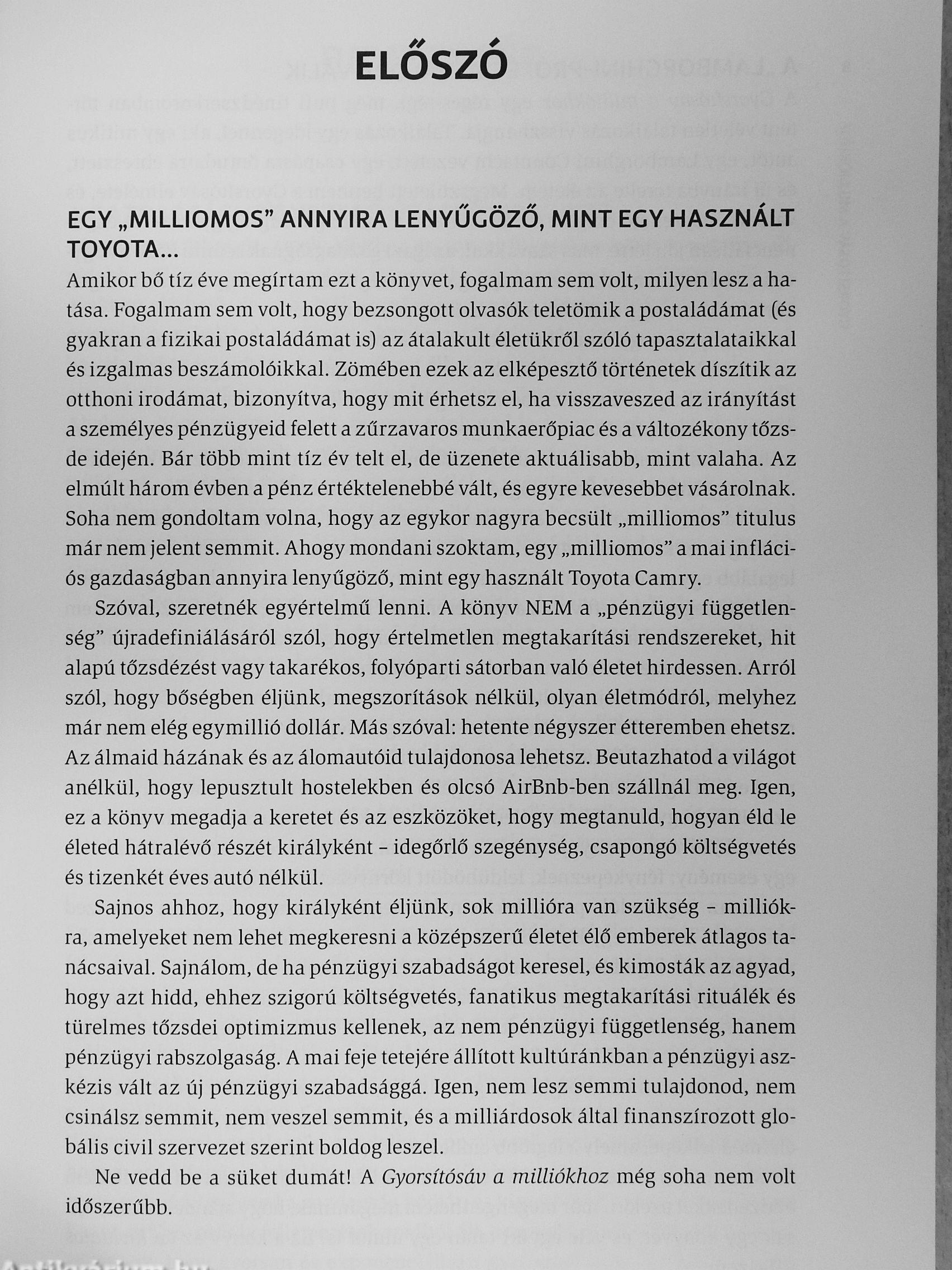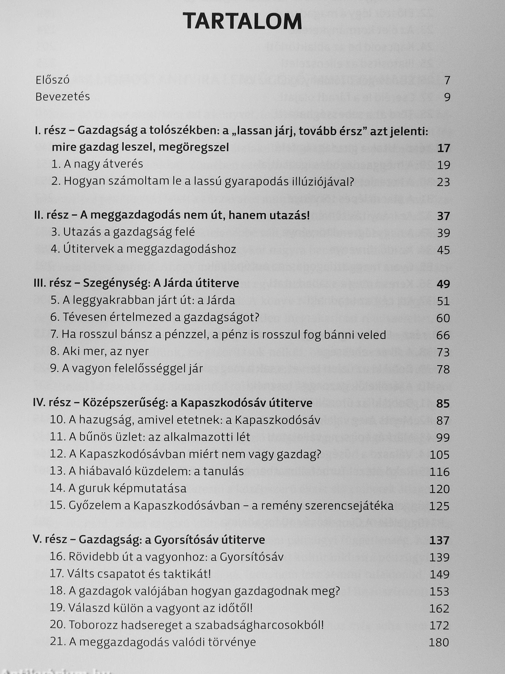 Agyadat átmosták azok a pénzügyi „szakértük", akik a „lassan járj, tovább érsz" elvét próbálják eladni neked. A meggazdagodásnak létezik egy matematikai törvényszerűségeken alapuló gyorsabb, rövidebb útja, amely lehetővé teszi, hogy most élj jól, ahelyett hogy gazdagon halnál meg. Ne csak várj és reménykedj, inkább válts a Gyorsitósávra, és valósítsd meg az álmaidat!
