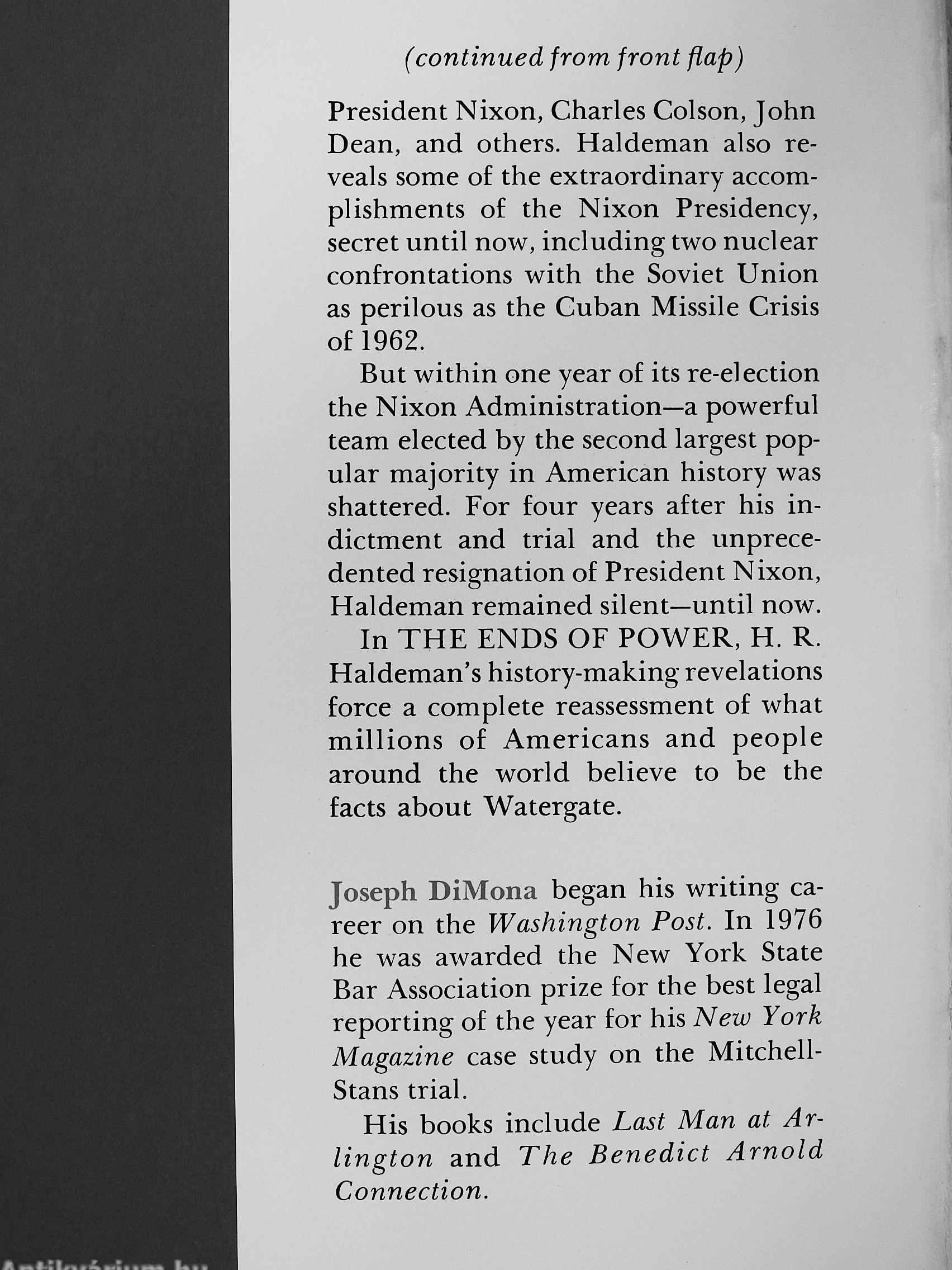 Having waited in vain for others, including Richard Nixon himself, to tell the truth about Watergate, THE ENDS OF POWER is H. R. Halde-man's searching and startling answer to the conflicting accounts that have appeared so far. Did Nixon order Watergate? What were the burglars looking for? Was the CIA involved? Who is the mysterious Deep Throat? What was on the 18i/2-minute tape erasure and who erased it?