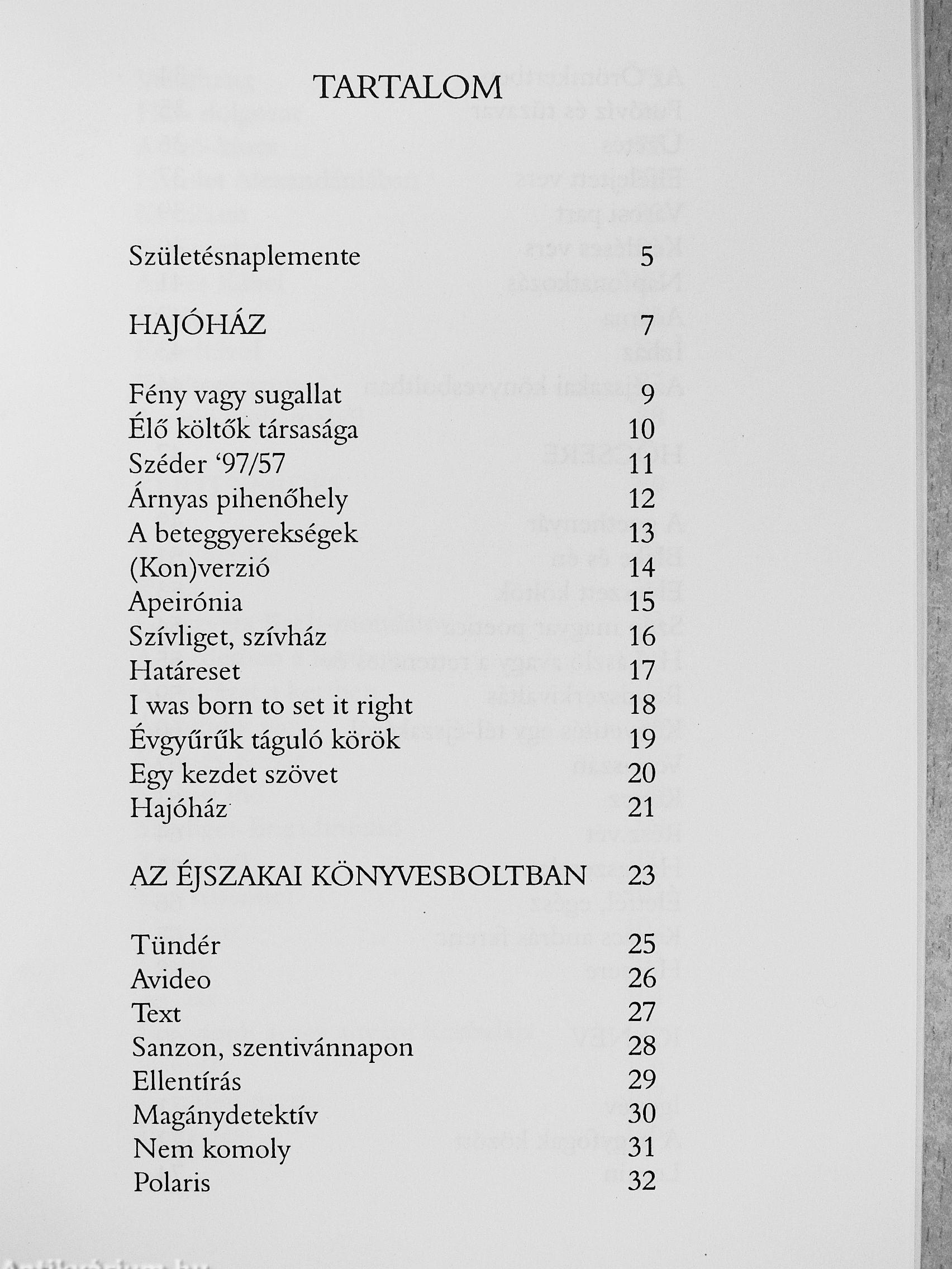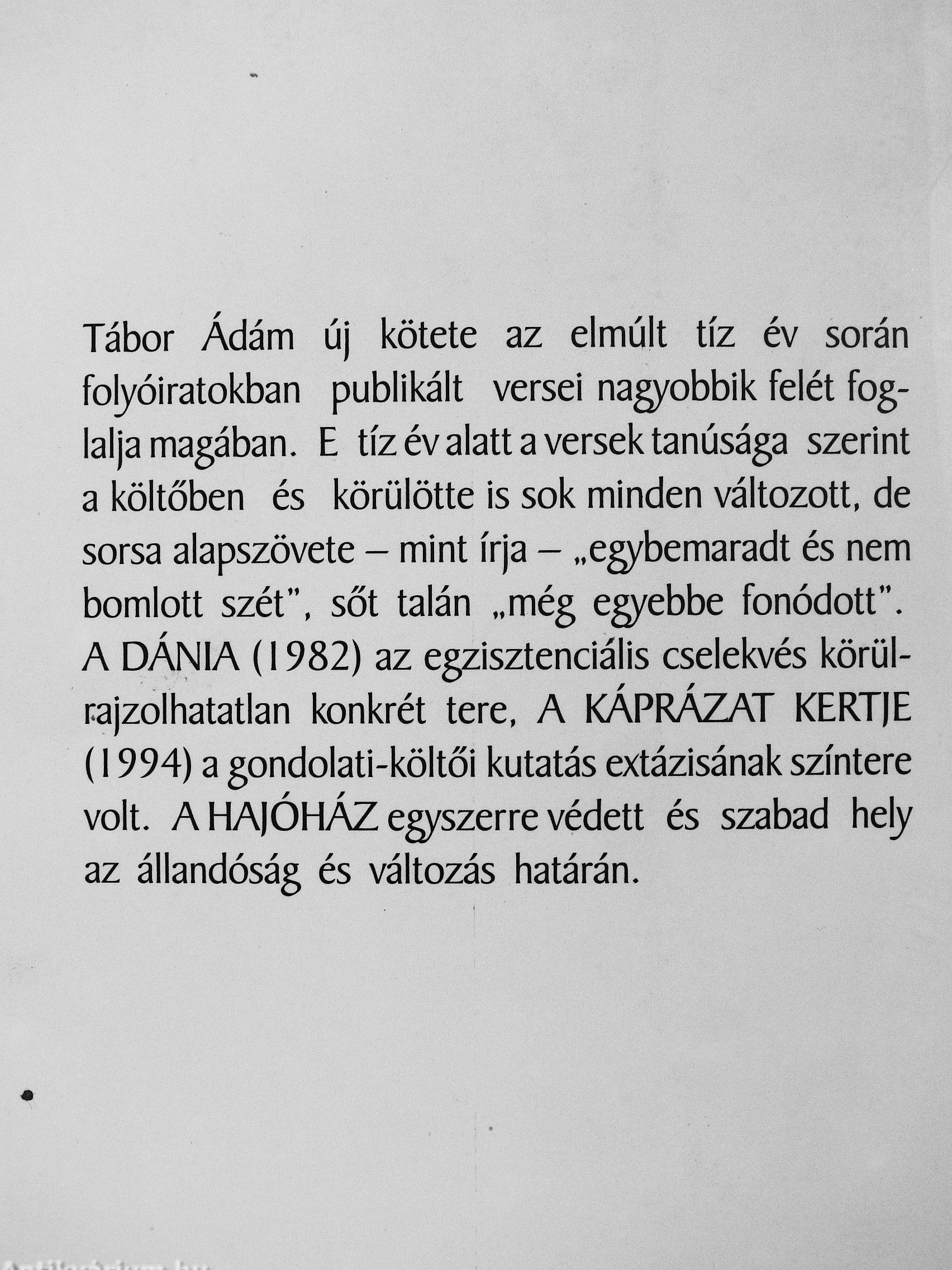 Tábor Ádám új kötete az elmúlt tíz év során folyóiratokban publikált versei nagyobbik felét fogalja magában. E tíz év alatt a versek tanúsága szerint a költőben és körülötte is sok minden változott, de sorsa alapszövete - mint írja - „egybemaradt és nem bomlott szét", sőt talán „még egyebbe fonódott". A DÁNIA (1982) az egzisztenciális cselekvés körülrajzol hatatlan konkrét tere, A KÁPRÁZAT KERTjE (1994) a gondolati-költői kutatás extázisának színtere volt. A HAjÓHÁZ egyszerre védett és szabad hely az állandóság és változás határán.