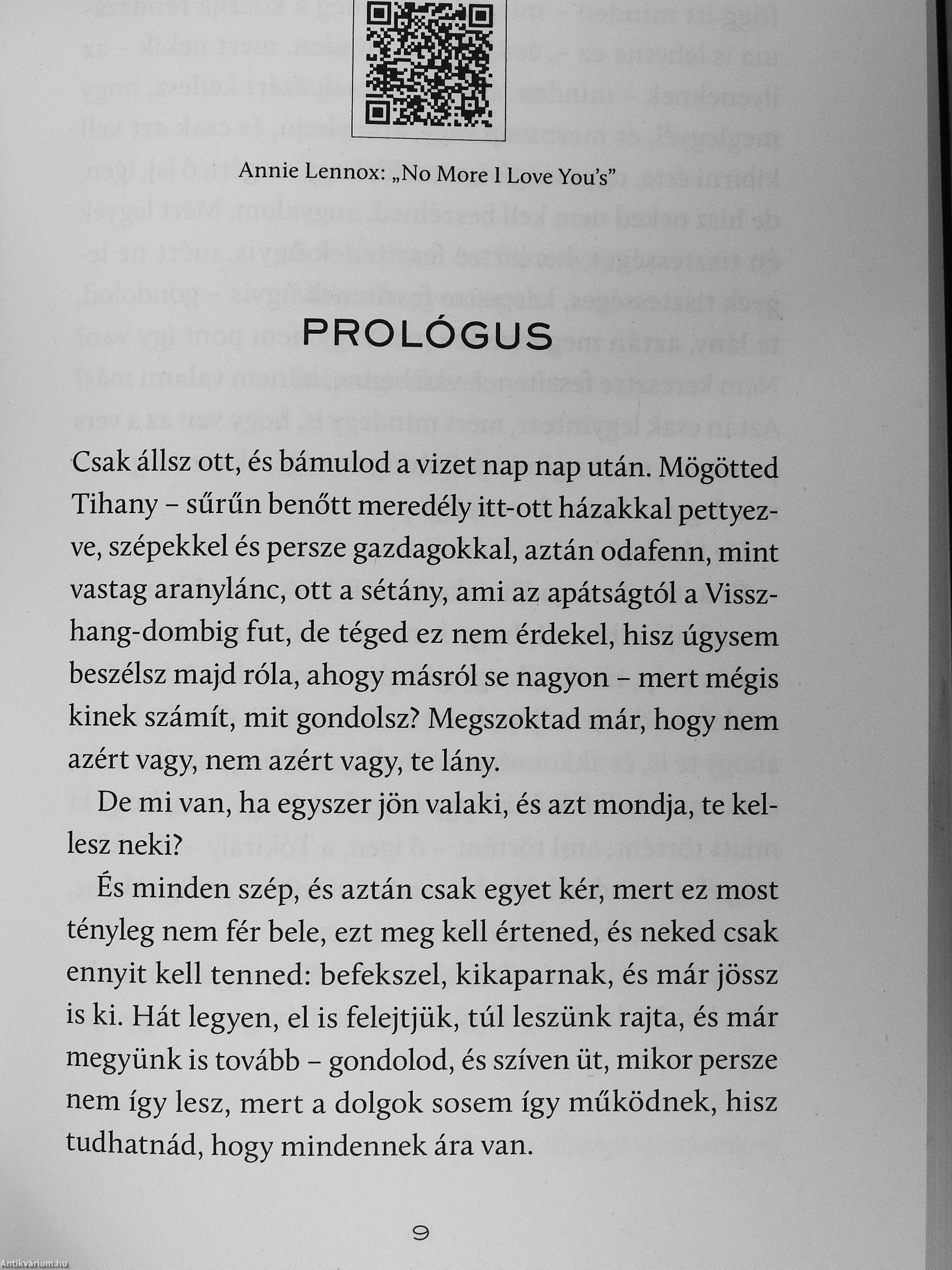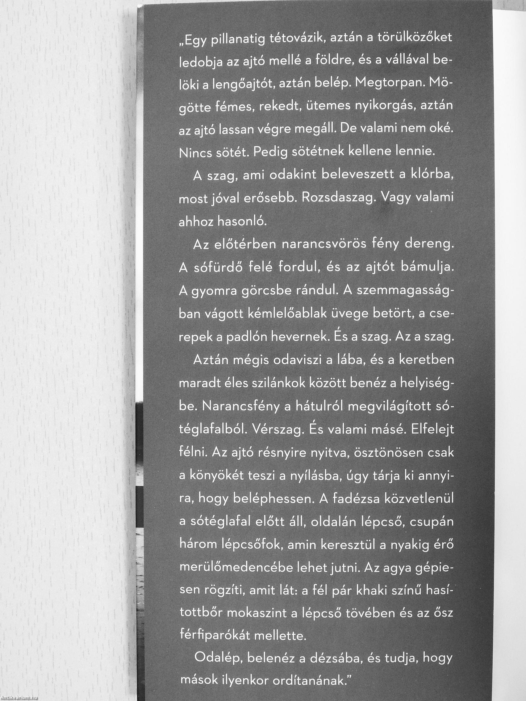 „Egy pillanatig tétovázik, aztán a törülközőket ledobja az ajtó mellé a földre, és a vállával belöki a lengőajtót, aztán belép. Megtorpan. Mögötte fémes, rekedt, ütemes nyikorgás, aztán az ajtó lassan végre megáll. De valami nem oké. Nincs sötét. Pedig sötétnek kellene lennie.