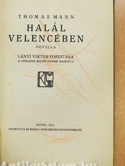 Aschenbach, avagy - ötvenedik születésnapja óta hivatalosan: von Aschenbach Gusztáv 19 .. - ban, abban az esztendőben, amely hónapokon át fenyegette vésztjósló arccal kontinensünket, egy tavaszi délután a müncheni Prinzregentstrassen levő lakásából magános sétára indúlt. Az írót még nehéz és kényes délelőtti munkája tartotta izgalomba, amely épp most roppant figyelmet, mérlegelést, behatóan és pontosan működő akaratot követelt; s a teremtő ösztönnek azt lendületét, azt a "motus animi contimuus"-t, amely, mint Cicero mondja, veleje az ékesszólásnak, még délebédje után sem tudta magában megfékezni és nem találta meg az enyhítő álmot, amire mostanában egyre könnyebben kimerülő ereje napközben egyszer annyira rászorúlt. Ezért mindjárt tea után a szabadba ment, azt remélve, hogy a friss levegő és a testmozgás talpra állítja és estéjét termékennyé teszi." Vissza