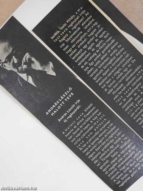 Mindezek előrebocsátása után be kell vallanom: a Halott teve kétrészes krimi és kalandregény. De a nyomozás, mint A Laurentis-ügyben - ürügy csupán arra, hogy erős nagyítású mikroszkóp alatt kíséreljem meg élve boncolni a gondolkodást, és persze egyben arra is, hogy e körmönfont módszerrel győzzem meg az olvasót: azért van feje, hogy gondolkozzék vele. Tessék, próbálja meg. De figyelmeztetem, gyarló önzés, írói hiúság is vezet, ha tisztán szívemből kívánom: sikerüljön neki.